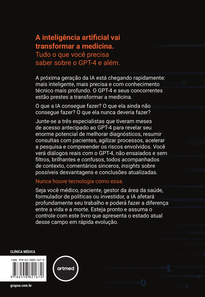 A inteligência artificial vai transformar a medicina.Tudo o que você precisa saber sobre o GPT-4 e além.A próxima geração da IA está chegando rapidamente: mais inteligente, mais precisa e com conhecimento técnico mais profundo. O GPT-4 e seus concorrentes estão prestes a transformar a medicina.O que a IA consegue fazer? O que ela ainda não consegue fazer? O que ela nunca deveria fazer?Junte-se a três especialistas que tiveram meses de acesso antecipado ao GPT-4 para revelar seu enorme potencial de melhorar diagnósticos, resumir consultas com pacientes, agilizar processos, acelerar a pesquisa e compreender os riscos envolvidos. Você verá diálogos reais com o GPT-4, não ensaiados e sem filtros, brilhantes e confusos, todos acompanhados de contexto, comentários sinceros, insights sobre possíveis desvantagens e conclusões atualizadas.