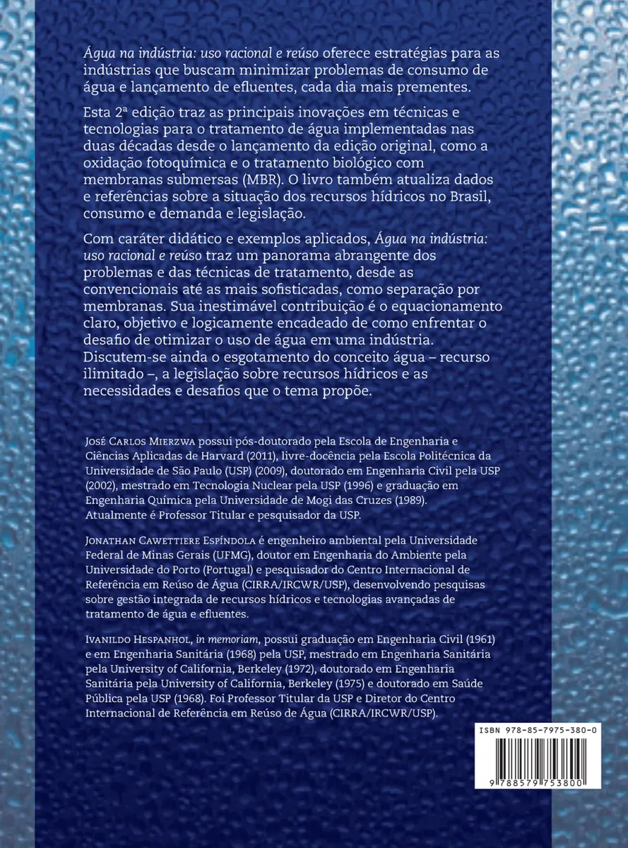 Água na indústria: uso racional e reúso oferece estratégias para as indústrias que buscam minimizar problemas de consumo de água e lançamento de efluentes, cada dia mais prementes. Esta 2ª edição traz as principais inovações em técnicas e tecnologias para o tratamento de água implementadas nas duas décadas desde o lançamento da edição original, como a oxidação fotoquímica e o tratamento biológico com membranas submersas (MBR). O livro também atualiza dados e referências sobre a situação dos recursos hídricos no Brasil, consumo e demanda e legislação. Com caráter didático e exemplos aplicados, Água na indústria: uso racional e reúso traz um panorama abrangente dos problemas e das técnicas de tratamento, desde as convencionais até as mais sofisticadas, como separação por membranas. Sua inestimável contribuição é o equacionamento claro, objetivo e logicamente encadeado de como enfrentar o desafio de otimizar o uso de água em uma indústria. Discutem-se ainda o esgotamento do conceito água – recurso ilimitado –, a legislação sobre recursos hídricos e as necessidades e desafios que o tema propõe.