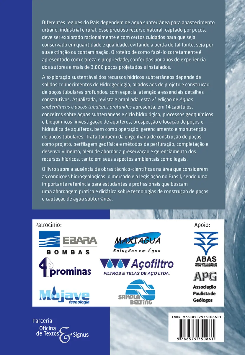 O Brasil detém 14% dos recursos hídricos do planeta, desse total, 97% são de águas subterrâneas. Com o aumento da demanda para abastecimento humano, industrial e do agronegócio, a exploração adequada e sustentável dos recursos hídricos subterrâneos é, atualmente, imprescindível. Nesse contexto, possuir sólidos conhecimentos de Hidrogeologia, aliado aos de projeto e construção de poços tubulares profundos, com especial atenção a essenciais detalhes construtivos, se fazem necessários. A 2ª edição de Águas subterrâneas e poços tubulares profundos, totalmente atualizada, revista e ampliada, apresenta, em 14 capítulos, conceitos sobre águas subterrâneas e ciclo hidrológico, processos geoquímicos e bioquímicos, investigação de aquíferos, prospecção e locação de poços, hidráulica de aquíferos, bem como operação, gerenciamento e manutenção de poços tubulares. O livro supre a ausência de obras técnico-científicas na área de hidrogeologia e apresenta com uma abordagem prática e didática tecnologias de construção de poços e captação e gerenciamento de águas subterrâneas. Conta ainda com a organização dos experientes autores Carlos Eduardo Quaglia Giampá e Valter Galdiano Gonçales além de mais 18 especialistas, consolidando-se assim como um livro de referência para estudantes e profissionais na área de Geologia, Engenharia Civil e Hidráulica e áreas afins.