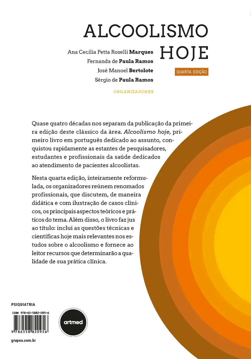 Quase quatro décadas nos separam da publicação da primeira edição deste clássico da área. Primeiro livro em português dedicado ao assunto, Alcoolismo hoje chega à sua quarta edição totalmente reformulado. Os organizadores, doutores Ana Cecilia Petta Roselli Marques, Fernanda de Paula Ramos, José Manoel Bertolote e Sérgio de Paula Ramos, reúnem renomados profissionais, que discutem, de maneira didática e com ilustração de casos clínicos, os principais aspectos teóricos e práticos do tema, incluindo as questões técnicas e científicas mais relevantes atualmente nos estudos sobre o alcoolismo e fornecendo ao leitor recursos que determinarão a qualidade de sua prática clínica.