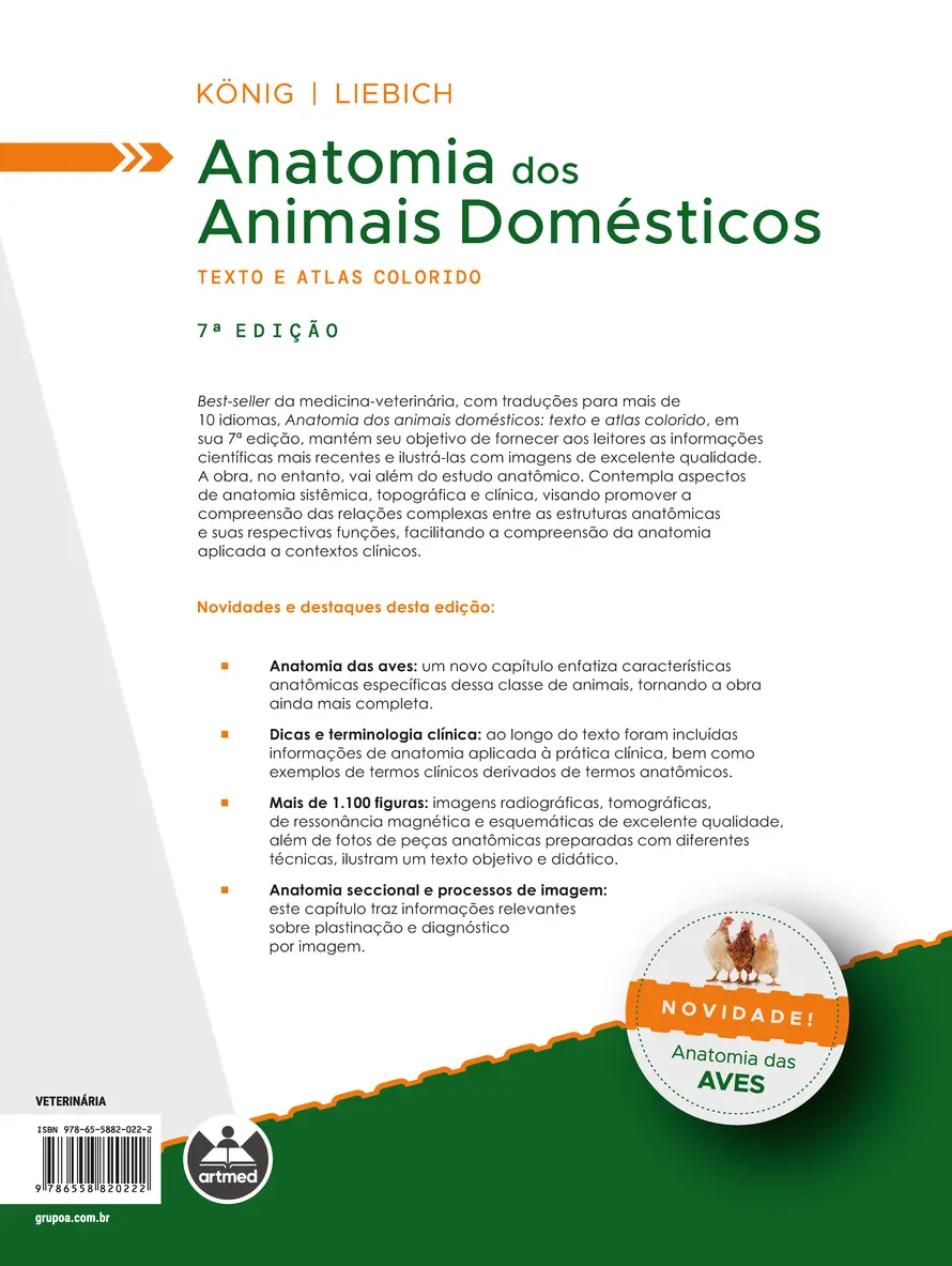 Em sua 7ª edição, o livro Anatomia dos animais domésticos: texto e atlas colorido, reúne mais de 1.100 imagens esquemáticas, radiográficas, tomográficas, de ressonáncia magnética, além de fotos de peças anatômicas preparadas com diferentes técnicas, que ilustram um texto objetivo e didático que vai além do estudo anatômico. A obra aborda também aspectos de anatomia sistêmica, topográfica e clínica, visando promover a compreensão das relações complexas entre as estruturas anatômicas e suas respectivas funções, facilitando a compreensão da anatomia aplicada a contextos clínicos. Além disso, um novo capítulo sobre anatomia das aves e inúmeras dicas clínicas e indicações de termos clínicos derivados de termos anatômicos distribuídos ao longo do livro tornam esta obra cada vez mais indispensável a estudantes e profissionais da área de medicina veterinária.