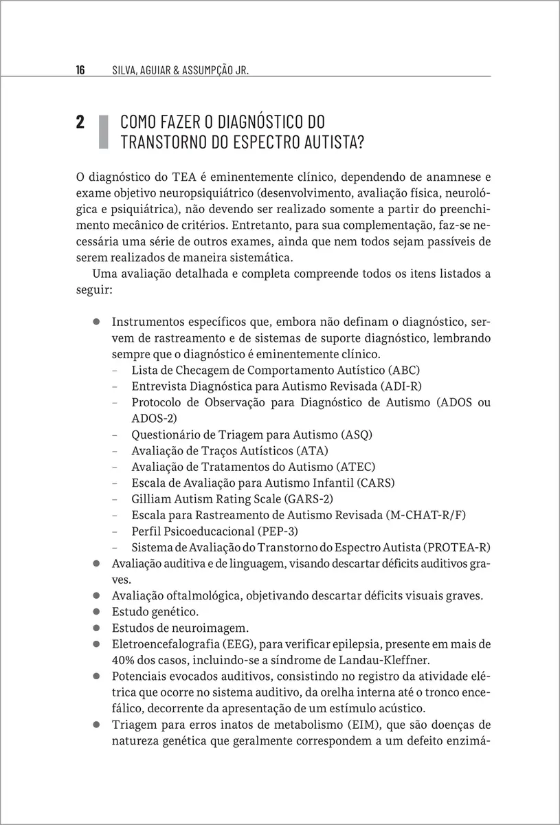 SILVIA, A. G.; AGUIAR, C.; ASSUMPÇÃO JR., F. B. Autismo: conceito, diagnóstico, intervenção e legislação. Porto Alegre: Artmed, 2024.