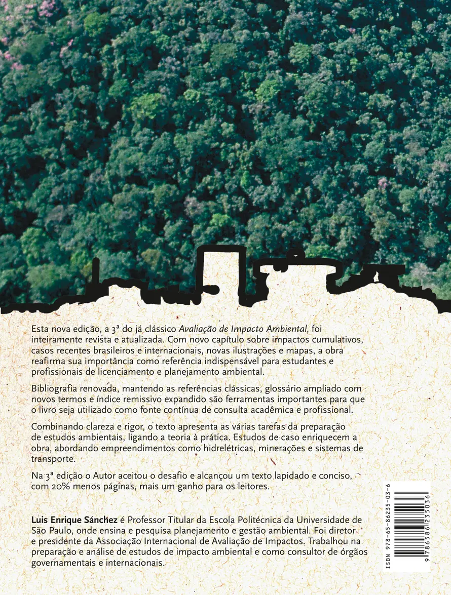 Esta nova edição, a 3ª do já clássico Avaliação de Impacto Ambiental, foi inteiramente revista e atualizada. Com novo capítulo sobre impactos cumulativos, casos recentes brasileiros e internacionais, novas ilustrações e mapas, a obra reafirma sua importância como referência indispensável para estudantes e profissionais de licenciamento e planejamento ambiental. Bibliografia renovada, mantendo as referências clássicas, glossário ampliado com novos termos e índice remissivo expandido são ferramentas importantes para que o livro seja utilizado como fonte contínua de consulta acadêmica e profissional. Combinando clareza e rigor, o texto apresenta as várias tarefas da preparação de estudos ambientais, ligando a teoria à prática. Estudos de caso enriquecem a obra, abordando empreendimentos como hidrelétricas, minerações e sistemas de transporte. Na 3ª edição o Autor aceitou o desafio e alcançou um texto lapidado e conciso, com 20% menos páginas, mais um ganho para os leitores.