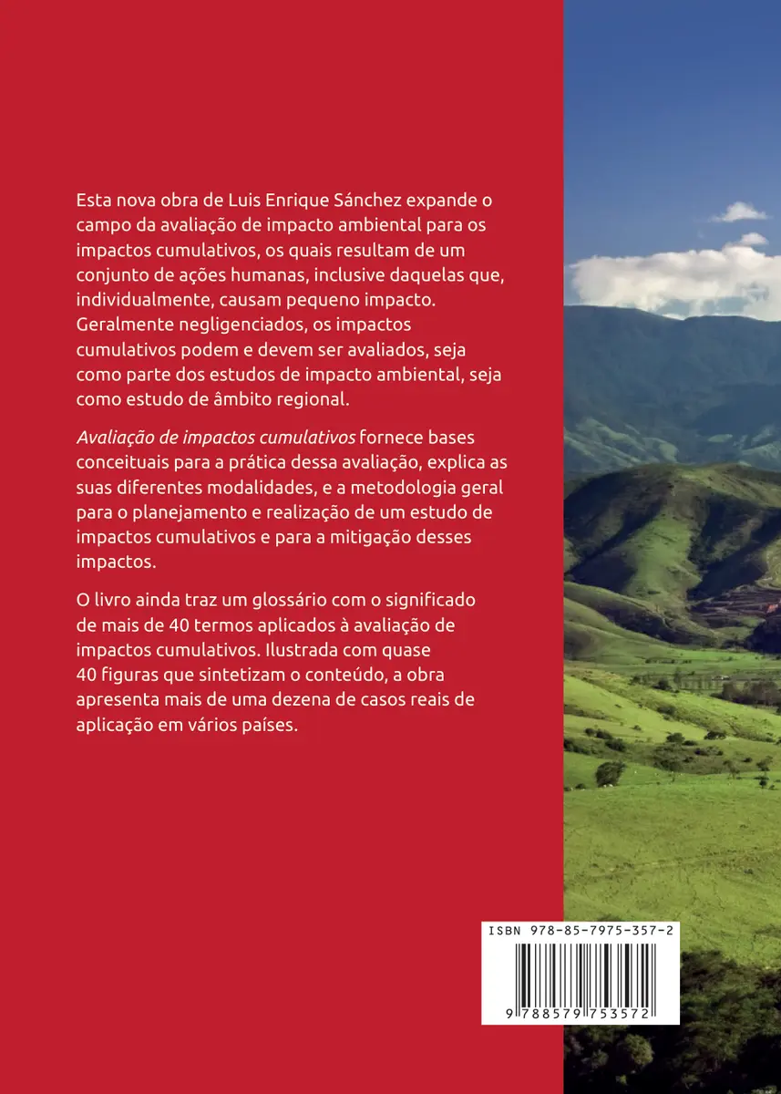 Esta nova obra de Luis Enrique Sánchez expande o campo da avaliação de impacto ambiental para os impactos cumulativos, os quais resultam de um conjunto de ações humanas, inclusive daquelas que, individualmente, causam pequeno impacto. Geralmente negligenciados, os impactos cumulativos podem e devem ser avaliados, seja como parte dos estudos de impacto ambiental, seja como estudo de âmbito regional. Avaliação de impactos cumulativos fornece bases conceituais para a prática dessa avaliação, explica as suas diferentes modalidades, e a metodologia geral para o planejamento e realização de um estudo de impactos cumulativos e para a mitigação desses impactos. O livro ainda traz um glossário com o significado de mais de 40 termos aplicados à avaliação de impactos cumulativos. Ilustrada com quase 40 figuras que sintetizam o conteúdo, a obra apresenta mais de uma dezena de casos reais de aplicação em vários países.