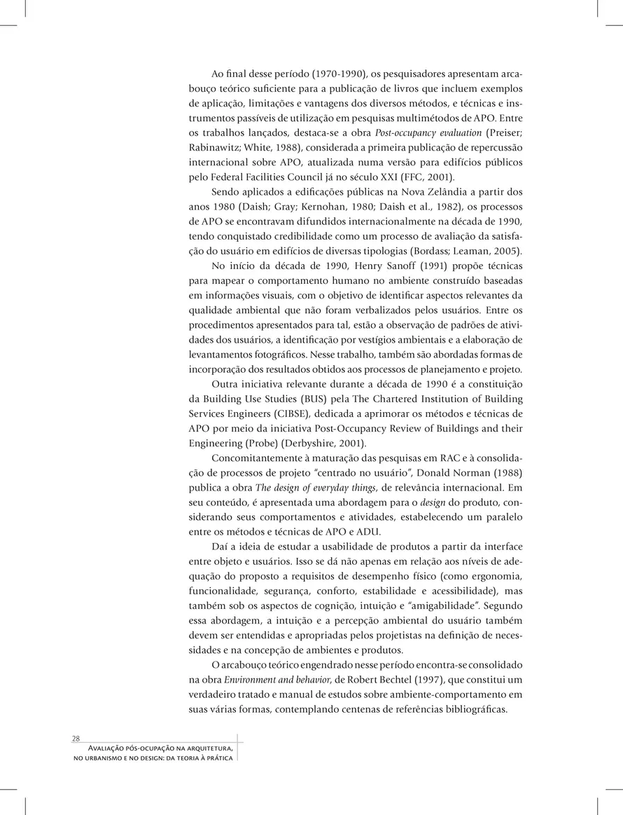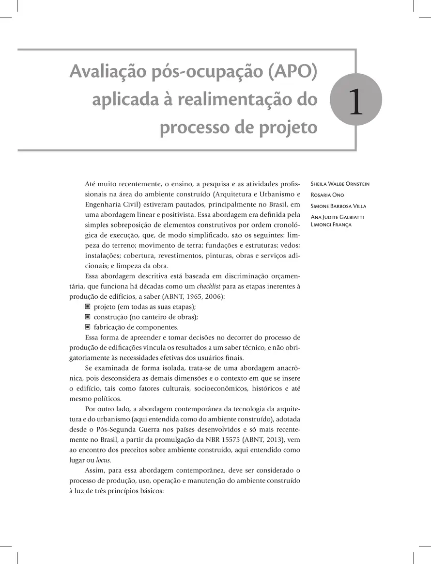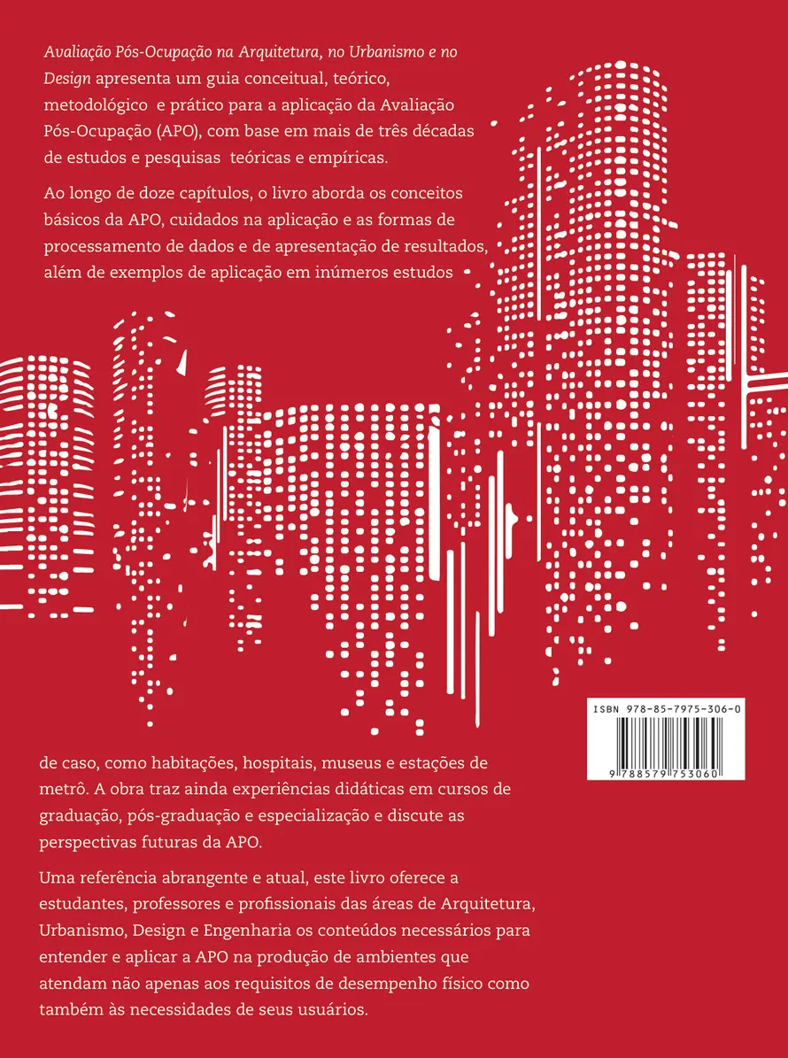 Avaliação pós-ocupação: na arquitetura, no urbanismo e no design apresenta um guia conceitual, teórico, metodológico e prático para a aplicação da Avaliação pós-ocupação (APO), com base em mais de três décadas de estudos e pesquisas teóricas e empíricas. Ao longo de doze capítulos, o livro aborda os conceitos básicos da APO, cuidados na aplicação e as formas de processamento de dados e de apresentação de resultados, além de exemplos de aplicação em inúmeros estudos de caso, como habitações, hospitais, museus e estações de metrô. A obra traz ainda experiências didáticas em cursos de graduação, pós-graduação e especialização e discute as perspectivas futuras da APO. Uma referência abrangente e atual, este livro oferece a estudantes, professores e profissionais das áreas de Arquitetura, Urbanismo, Design e Engenharia os conteúdos necessários para entender e aplicar a APO na produção de ambientes que atendam não apenas aos requisitos de desempenho físico como também às necessidades de seus usuários.