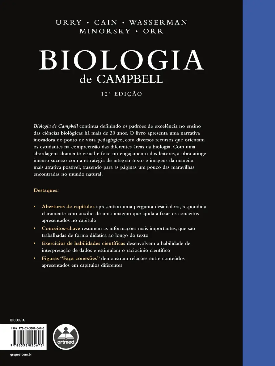 Biologia de Campbell continua definindo os padrões de excelência no ensino das ciências biológicas há mais de 30 anos. O livro apresenta uma narrativa inovadora do ponto de vista pedagógico, com diversos recursos que orientam os estudantes na compreensão das diferentes áreas da biologia. Com uma abordagem altamente visual e foco no engajamento dos leitores, a obra atinge imenso sucesso com a estratégia de integrar texto e imagens da maneira mais atrativa possível, trazendo para as páginas um pouco das maravilhas encontradas no mundo natural.