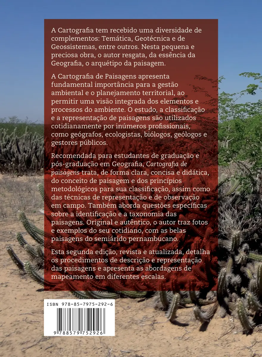 A Cartografia tem recebido uma diversidade de complementos: Temática, Geotécnica e de Geossistemas, entre outros. Nesta pequena e preciosa obra, o autor resgata, da essência da Geografia, o arquétipo da paisagem. A Cartografia de Paisagens apresenta fundamental importância para a gestão ambiental e o planejamento territorial, ao permitir uma visão integrada dos elementos e processos do ambiente. O estudo, a classificação e a representação de paisagens são utilizados cotidianamente por inúmeros profissionais, como geógrafos, ecologistas, biólogos, geólogos e gestores públicos. Recomendada para estudantes de graduação e pós-graduação em Geografia, Cartografia de paisagens trata, de forma clara, concisa e didática, do conceito de paisagem e dos princípios metodológicos para sua classificação, assim como das técnicas de representação e de observação em campo. Também aborda questões específicas sobre a identificação e a taxonomia das paisagens. Original e autêntico, o autor traz fotos e exemplos do seu cotidiano, com as belas paisagens do semiárido pernambucano. Esta segunda edição, revista e atualizada, detalha os procedimentos de descrição e representação das paisagens e apresenta as abordagens de mapeamento em diferentes escalas.