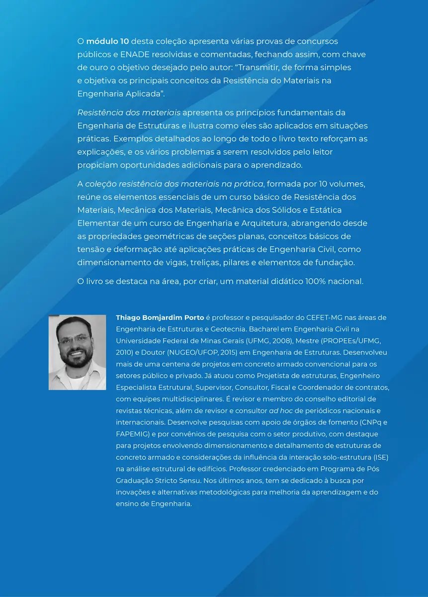 Repleta de exemplos práticos, exercícios resolvidos e explicações didáticas, a coleção é uma importante referência técnica sobre Resistência dos Materiais para estudantes e jovens profissionais de Engenharia Civil e Arquitetura.