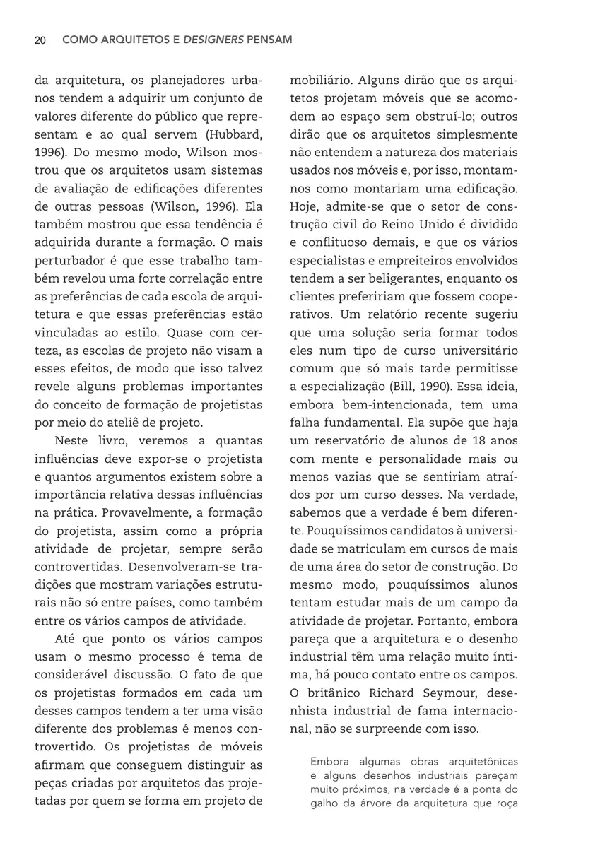 Como Arquitetos e Designers Pensam traz investigações em metodologia de projeto e enriquece as discussões sobre o papel dos designers e projetistas em áreas nas quais a forma se traduz em conceitos e ideias. Analisa estilos de pensamento, os problemas em projetos e apresenta táticas inovadoras que auxiliam no processo de criação.
