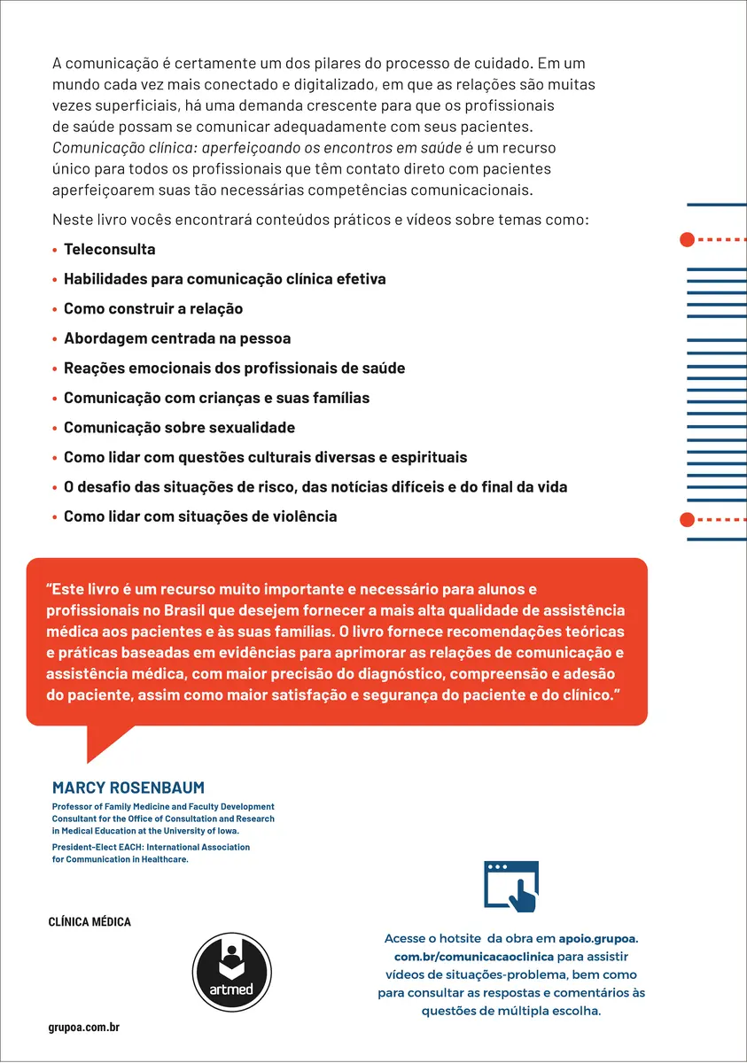 A comunicação adequada e centrada no paciente é essencial para a prática clínica de alta qualidade. Estudos sobre comunicação centrada no paciente mostram melhores resultados de saúde, melhor satisfação e adesão do paciente, bem como níveis reduzidos de desconforto e preocupação, melhora da saúde mental. Também são encontrados menos testes diagnósticos e encaminhamentos, indicando um aumento da eficiência do atendimento. Esta obra foi elaborada com o objetivo de oferecer os melhores subsídios sobre o tema, os quais são complementados por situações-problema ao longo do livro, aliando a teoria à prática.