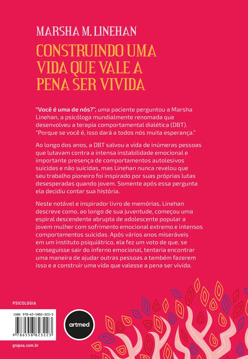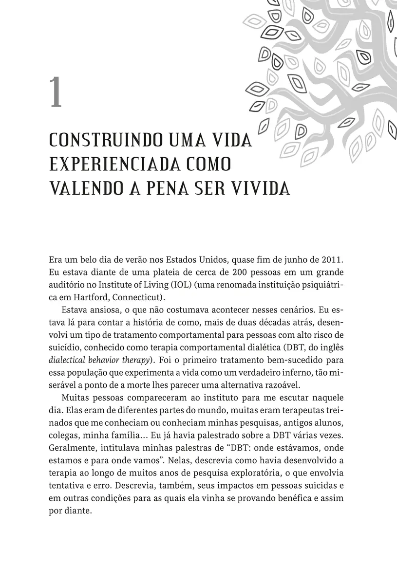 Neste brilhante livro de memórias, Marsha M. Linehan, uma das mais notáveis psicoterapeutas da atualidade, compartilha com o leitor sua experiência de vida. A autora, diagnosticada com transtorno da personalidade borderline, revela suas cicatrizes físicas e emocionais, apresentando os momentos-chave – como a conquista o mundo acadêmico dominado por homens – que a levaram à criação da terapia comportamental dialética (DBT).