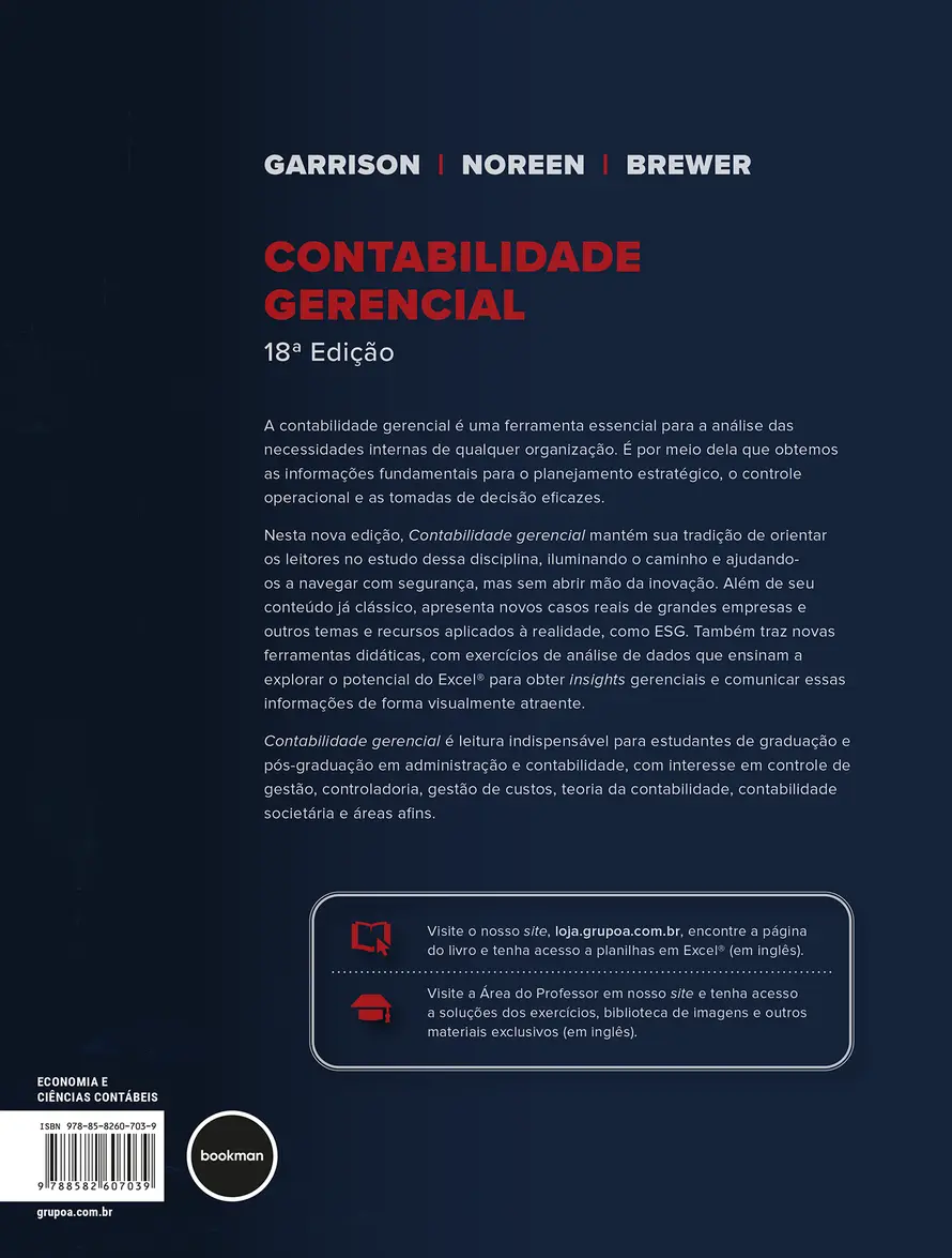 Contabilidade gerencial é leitura indispensável para estudantes de graduação e pós-graduação em administração e contabilidade, com interesse em controle de gestão, controladoria, gestão de custos, teoria da contabilidade, contabilidade societária e áreas afins.