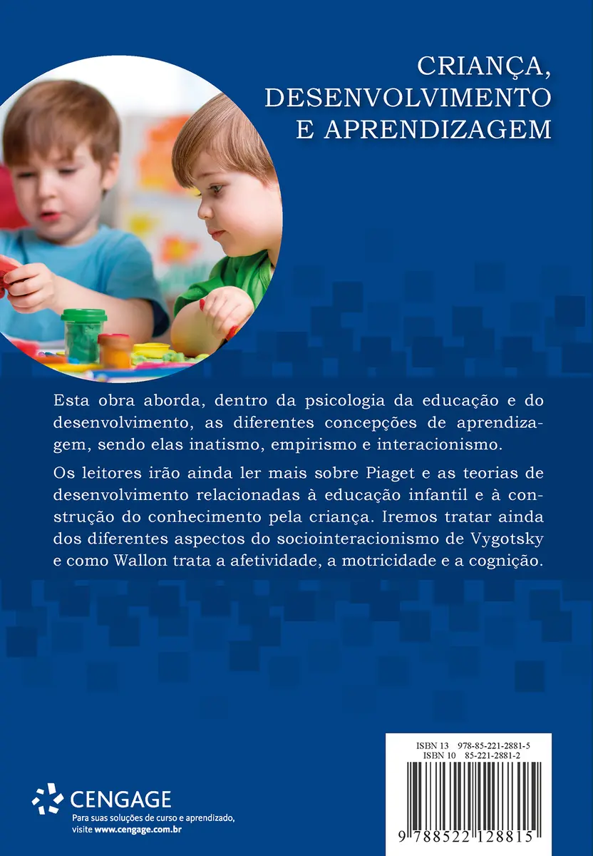 Esta obra aborda, dentro da psicologia da educação e do desenvolvimento, as diferentes concepções de aprendizagem, sendo elas inatismo, empirismo e interacionismo. Os leitores irão ainda ler mais sobre Piaget e as teorias de desenvolvimento relacionadas à educação infantil e a construção do conhecimento pela criança. Iremos tratar ainda dos diferentes aspectos do sSociointeracionismo de Vygotsky e como Wallon trata a afetividade, a motricidade e a cognição.