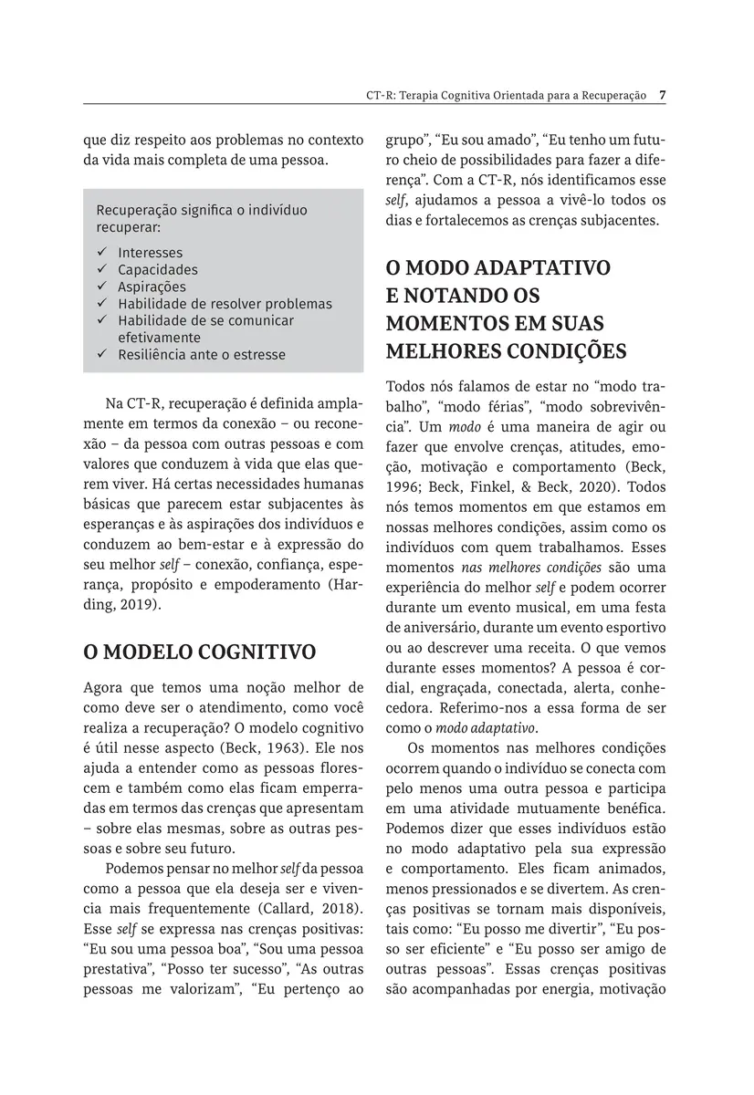BECK, A. T. et al. CT-R - Terapia cognitiva orientada para a recuperação de transtornos mentais desafiadores. Porto Alegre: Artmed, 2022.