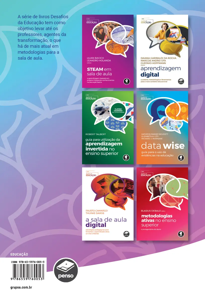 Neste livro, a aprendizagem invertida (flipped learning) é apresentada por Robert Talbert de maneira acessível, prática e com foco no ensino superior. Além de ser um guia para aqueles que querem começar a inverter suas aulas, esta obra descreve estruturas e estratégias para que professores planejem melhor suas aulas e tornem a aprendizagem invertida uma parte permanente de suas práticas de ensino, tanto em disciplinas presenciais quanto a distância.
