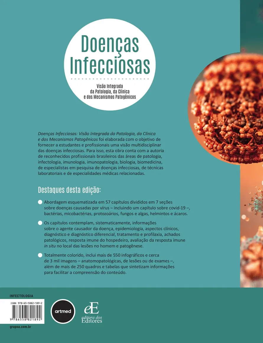 Elaborada com o objetivo de fornecer a estudantes e profissionais uma visão multidisciplinar do assunto, Doenças Infecciosas: Visão Integrada da Patologia, da Clínica e dos Mecanismos Patogênicos conta com a autoria de reconhecidos profissionais brasileiros das áreas de patologia, infectologia, imunologia, imunopatologia, biologia, biomedicina, de especialistas em pesquisa de doenças infecciosas, de técnicas laboratoriais e de especialidades médicas relacionadas.Os conteúdos, que refletem a realidade brasileira, são esquematizados e apresentados em 57 capítulos, divididos em 7 seções, os quais tratam das doenças causadas por vírus – incluindo um capítulo sobre covid-19 –, bactérias, micobactérias, protozoários, fungos e algas, helmintos e ácaros. Cada capítulo contempla, sistematicamente, informações sobre o agente causador da doença, epidemiologia, aspectos clínicos, diagnóstico e diagnóstico diferencial, tratamento e profilaxia, achados patológicos, resposta imune do hospedeiro, avaliação da resposta imune in situ no local das lesões no homem e patogênese.E, para facilitar a compreensão dos conteúdos, o livro, totalmente colorido, traz mais de 550 infográficos e cerca de 3 mil imagens – anatomopatológicas, de lesões ou de exames –, além de mais de 250 quadros e tabelas que sintetizam as informações apresentadas.