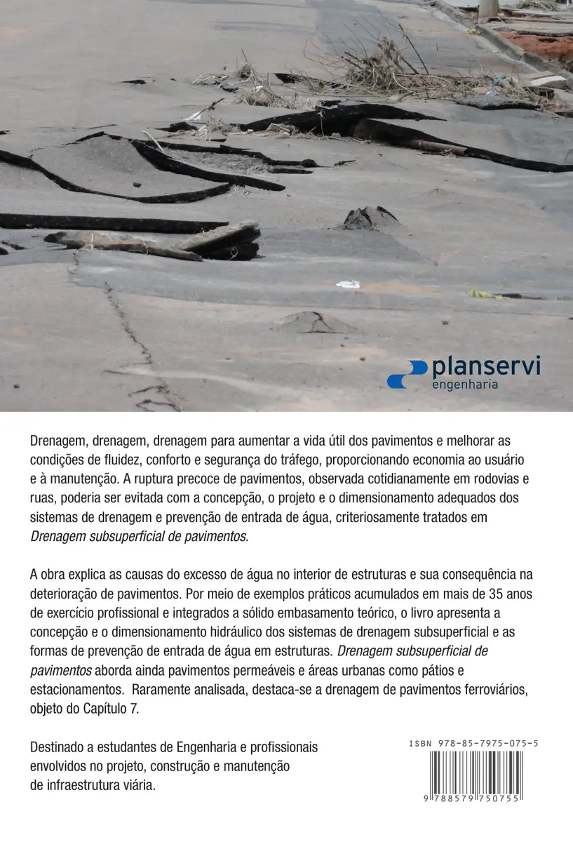 Explica a deterioração dos pavimentos causada pelo excesso de água que infiltra no interior da estrutura, apresentando os benefícios da drenagem subsuperficial. Discute os problemas decorrentes da drenagem inadequada, assim como procedimentos e exemplos de métodos de dimensionamento hidráulico no sistema de drenagem de pavimentos. Destinado a estudantes de Engenharia e uma importante referência profissional em projeto, construção e manutenção de infraestrutura viária.
