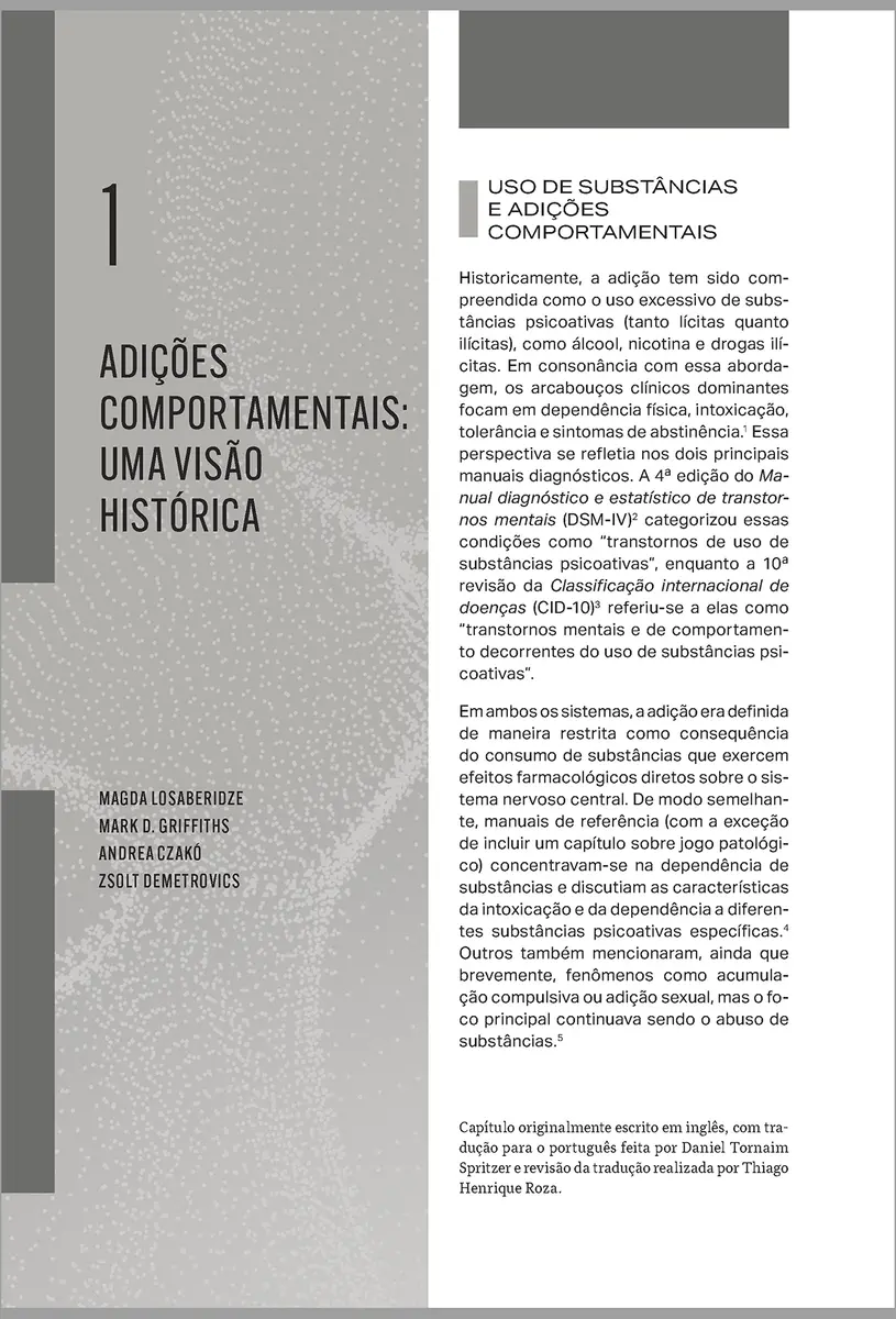 Esta obra é a primeira referência brasileira abrangente sobre adições tecnológicas e outras adições comportamentais, tema emergente que preocupa profissionais da saúde, educadores e famílias. O livro aborda transtornos contemporâneos relacionados a comportamentos impulsivos e compulsivos vinculados, entre outros, a compras, videogames, smartphones, mídias sociais e pornografia, um fenômeno cujo impacto vêm crescendo com o avanço tecnológico. Os capítulos trazem ao leitor desde conhecimentos básicos até informações para aprofundamento clínico a partir de análise científica rigorosa conduzida por especialistas brasileiros e estrangeiros.