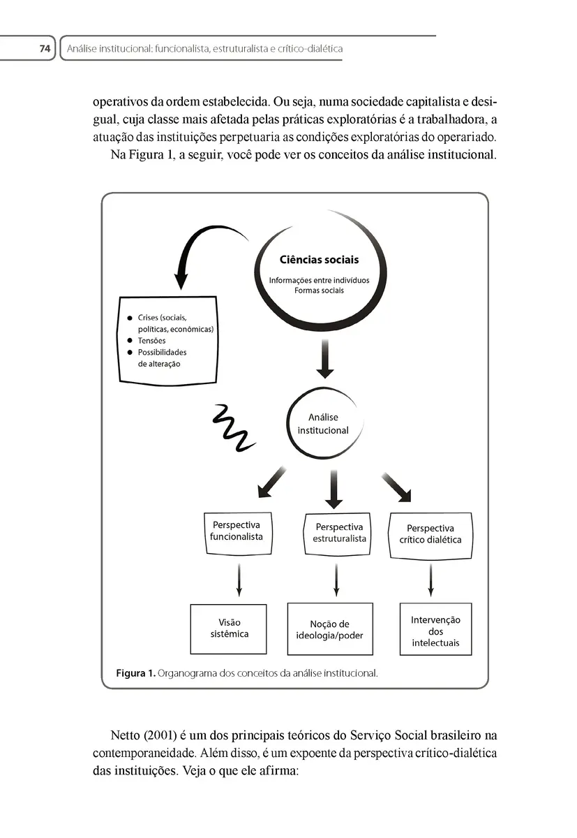 Quando observamos a vida em sociedade, quando buscamos conhecer como as diversas sociedades se organizaram e como construíram os seus códigos de conduta e suas estratégias de vida coletiva, aquilo que melhor descreve e explica esses elementos são as instituições. Uma instituição pode possuir os mais variados tamanhos e áreas de influência na vida do coletivo e do indivíduo de forma particular. Pode ser entendida enquanto microssistemas que direcionam ou influenciam a forma de nos organizarmos em sociedade. Essas instituições podem ser formais ou informais, municipais ou globais, generalistas ou específicas, podemos perceber sua influência ou nem sabermos de sua existência. Portanto, um profissional do Serviço Social deve ser capaz de produzir análises qualificadas das instituições, sendo essa uma competência necessária ao desenvolvimento de seu exercício profissional. Entender como se processa no cotidiano institucional a burocracia, as disputas pela hegemonia e as relações de poder é essencial para construir intervenções qualificadas. Apenas um assistente social capaz de reconhecer as diferentes vertentes da análise institucional pode desenvolver, de forma exemplar, a sua atuação nos mais diversos espaços socio-ocupacionais onde é demandado. Neste livro, portanto, você aprenderá sobre as instituições, desde a sua conceituação, seus elementos, suas teorias sociais e suas contribuições para o tema, até a complexidade da intervenção do assistente social em cada espaço de atuação. Ainda, você estudará aspectos relativos à inserção do profissional nas mais variadas instituições e encontrará, nesta leitura, subsídios para a construção de uma intervenção crítica e transformadora diante da amplitude das instituições.