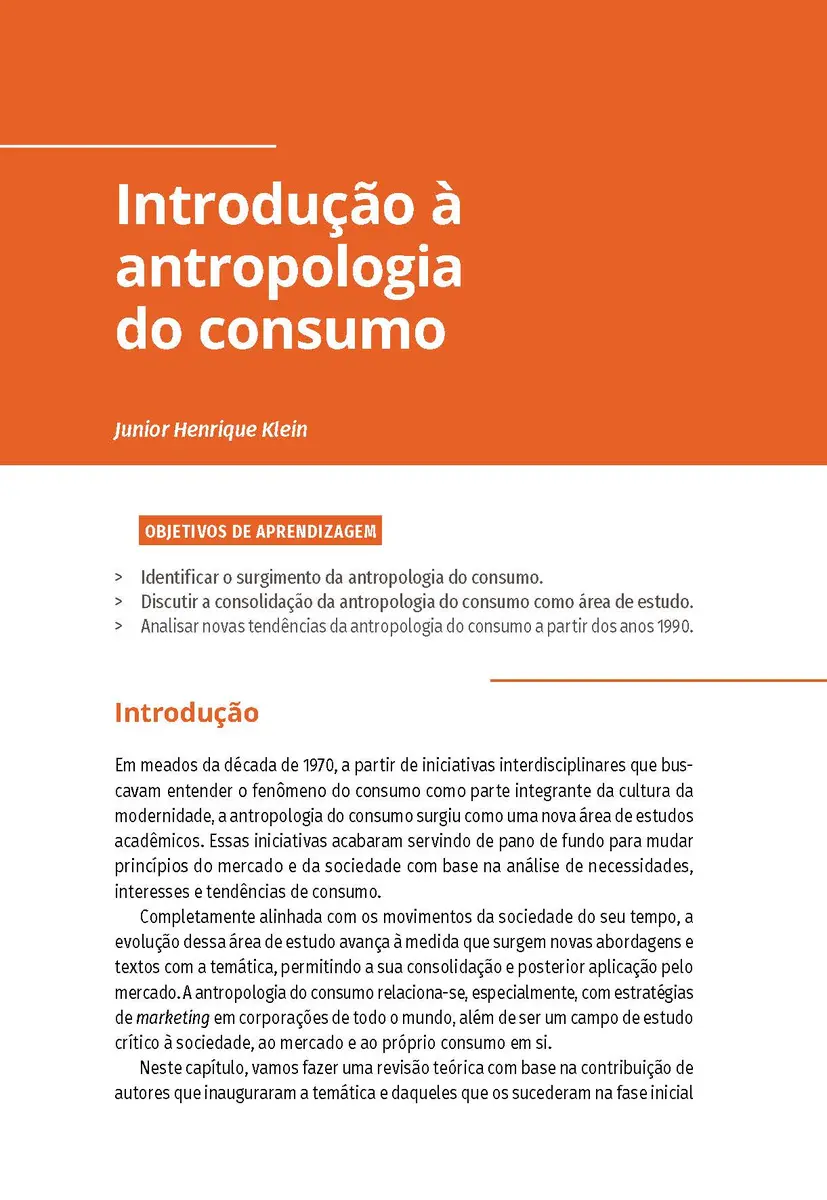Atualmente, é importante entender o consumo, um dos objetos de estudo do marketing, de um ponto de vista social, cultural e comportamental. Neste livro, Antropologia do consumo, o leitor vai ver diversas reflexões acerca do consumo, como o impacto dele em diferentes culturas ao redor do mundo, a influência do consumismo sobre as identidades locais, as tendências de comportamento dos consumidores no mundo digital e o consumo responsável e sustentável.