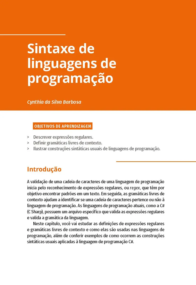 O desenvolvimento de sistemas de software é sustentado por uma ampla variedade de linguagens de programação, frameworks, bibliotecas e APIs — desde sistemas embarcados, aplicativos para dispositivos móveis e aplicativos para web, até os aplicativos mais tradicionais para desktop. Todos eles têm em comum o fato de serem escritos em linguagens de alto nível que precisam de tradução/compilação para uma linguagem de baixo nível. Essa linguagem de baixo nível é, então, compreendida pela máquina ou executada/interpretada diretamente dentro de um ambiente adequado. Neste livro, você vai conhecer as técnicas e as ferramentas necessárias para a construção de compiladores e interpretadores. Entre outros tópicos, serão abordadas a definição formal de linguagens por meio de expressões regulares e gramáticas; a especificação de reconhecedores de linguagens via autômatos de diferentes tipos; as etapas de análise léxica, sintática e semântica; bem como a geração e a otimização de código.