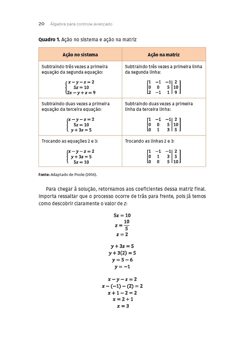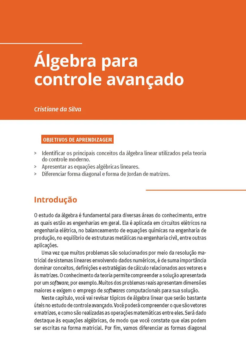 No controle moderno, são analisados os estados do sistema. Por meio de técnicas modernas, os parâmetros dos controladores podem ser otimizados, uma vez que o projetista tem acesso aos estados do sistema. O controle avançado, portanto, tem uma ligação muito forte com a álgebra linear. Assim, esta obra inicia pela revisão das técnicas de manipulação e operação de matrizes, como, por exemplo, cálculo de determinante, transposição e inversão. O cálculo de autovalores e autovetores também será bastante explorado. Mais adiante, novos termos serão apresentados, como o posto da matriz. Esses conhecimentos proporcionarão, ao aluno, o ferramental necessário para fazer a análise das funções de transferências que serão transferidas do domínio da frequência para o conjunto de matriz e vetores, conhecido como espaço de estados.