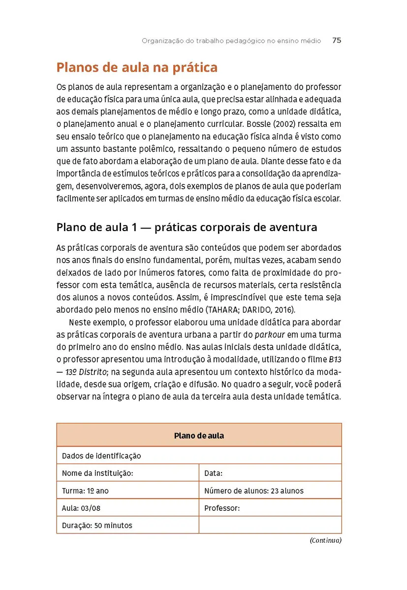 Neste livro, você vai refletir sobre a educação física no ensino médio, compreendendo suas características pedagógicas e sociopolíticas, bem como seu papel na promoção da saúde. Você também vai conhecer os aspectos legais, as diretrizes e os parâmetros que orientam, por meio dos eixos transversais, o ensino médio e a disciplina de educação física. Além disso, este livro discute o papel do professor de educação física no ensino médio, explica como elaborar um plano de aula para essa etapa de ensino e reflete sobre a importância das práticas avaliativas para a formação integral do aluno de ensino médio.