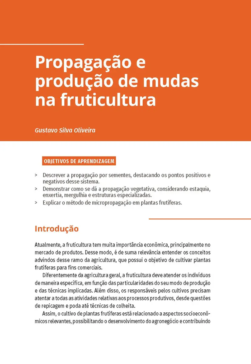 A adoção da fruticultura como atividade econômica traz consigo a incorporação do conhecimento sobre o desenvolvimento vegetal, a fisiologia das plantas, meios para se realizar a propagação de mudas, manejo de pomares, manejo de solo, medidas de controle sanitário, processo produtivo, comercialização, entre outras questões importantes para a escolha e a atuação nesse setor da agricultura. Todos esses tópicos são abordados neste livro, que contém a base teórica essencial ao futuro ou já atuante profissional da área.
