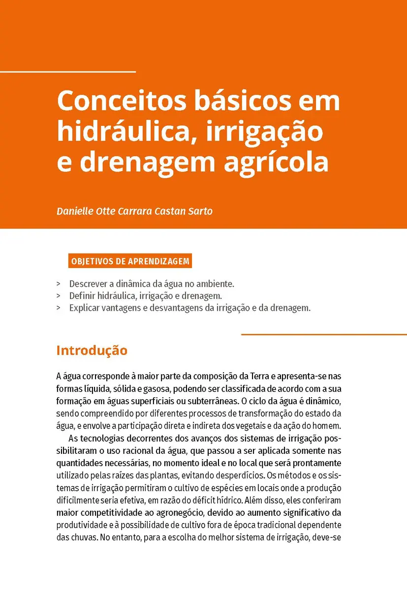 Neste livro, você verá as principais técnicas de irrigação utilizadas na agricultura e como elas contribuem para a produtividade e qualidade dos produtos, especialmente em áreas que sofrem com a escassez de chuvas. A obra também apresenta critérios e possibilidades para a execução de projetos de irrigação envolvendo a hidráulica, área que é responsável pela condução dessa água até os ambientes de cultivo. Por fim, verá a importância do uso adequado da água — insumo prioritário para a agricultura e para a vida.