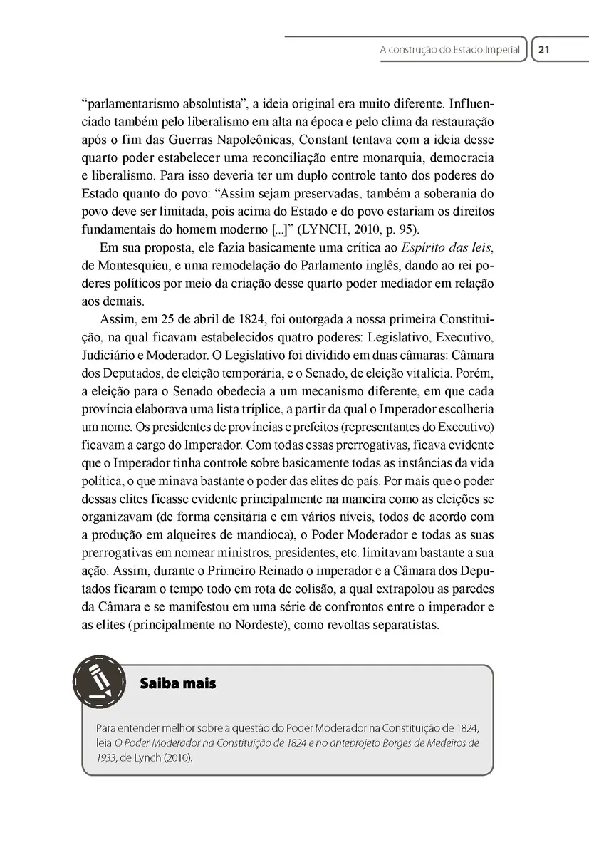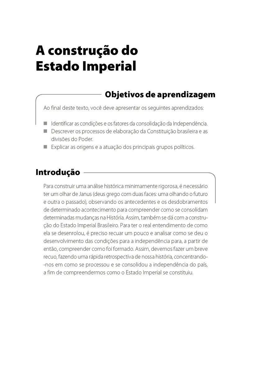 Neste livro, você encontrará diferentes discussões acerca dos principais marcos da história do Brasil Império, como o processo de construção do Estado Imperial, a presença das elites regionais no poder, os diferentes conflitos e crises na política de D. Pedro II, as características do período regencial, a chegada de D. Pedro II ao poder, a questão dos africanos e imigrantes no Brasil, o desenvolvimento do ciclo cafeeiro, as leis abolicionistas, a crise na política interna e externa do segundo reinado e, por fim, a queda da Monarquia e a instituição da República.