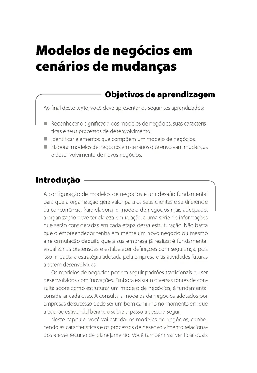 A emergência da era da informação, das novas tecnologias da informação e comunicação, da robótica, dos modelos de aceleração dos negócios e startups, dos processos organizacionais colaborativos resultantes das transformações comportamentais e de consumo, pressionam, cada vez mais, empresas e profissionais que desejam se manter competitivos. Ampliar a capacidade de gerar uma nova cultura organizacional, subsidiada pela inovação, competência, empreendedorismo e modelos colaborativos de organização se tornou essencial. Profissionais, portanto, precisam reconhecer os modelos de negócios e os seus processos de desenvolvimento, a fim de compreender como a nova dinâmica dos mercados, do relacionamento das pessoas, do consumo, podem ser convertidos em oportunidades de negócio. Nesta obra, você estudará os modelos de negócios, como construí-lo e estruturá-lo; reconhecerá os cenários de mudanças, as tendências e tecnologias, conhecimentos essenciais para manter um negócio em um mercado cada vez mais competitivo e dinâmico.