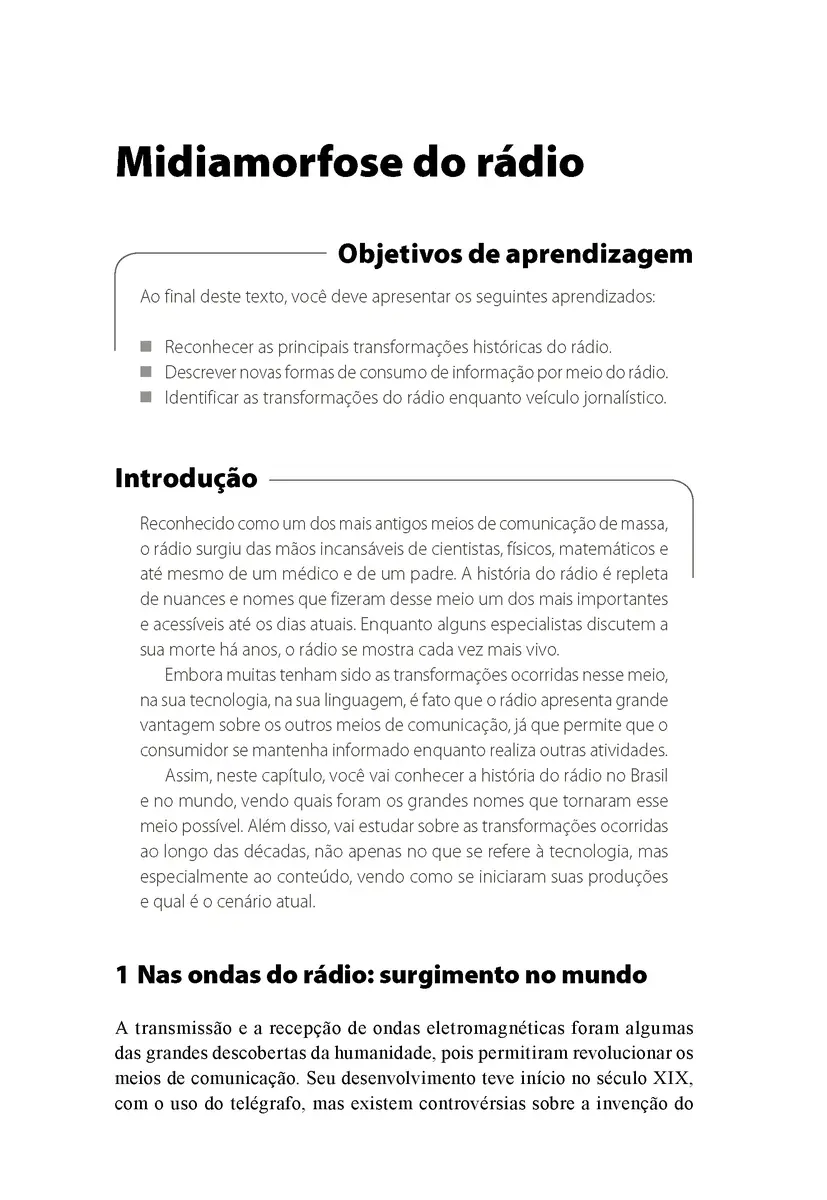 Em um grande panorama, o livro Novas linguagens do rádio mostra as diversas adaptações pelas quais o rádio passou para adequar-se ao contexto atual e manter-se como um dos principais e mais importantes meios de comunicação para a sociedade. Esta obra apresenta conteúdos essenciais à formação profissional, tais como rádio expandido, rádio como mídia sonora e midiamorfose.