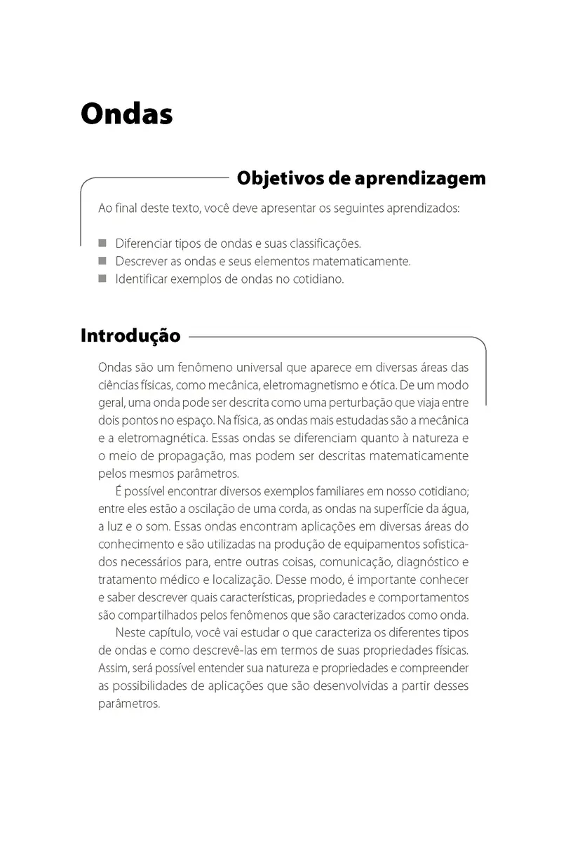 O estudo dos fenômenos de oscilações, dos diferentes tipos de ondas e seus elementos, além da introdução à mecânica de fluidos, ajuda a compreender importantes fenômenos presentes nas engenharias e em suas aplicações no dia a dia. Nesta obra, você será apresentado aos conteúdos de oscilações, ondas e mecânica dos fluidos, entendendo matematicamente os principais fenômenos e identificando exemplos do cotidiano.