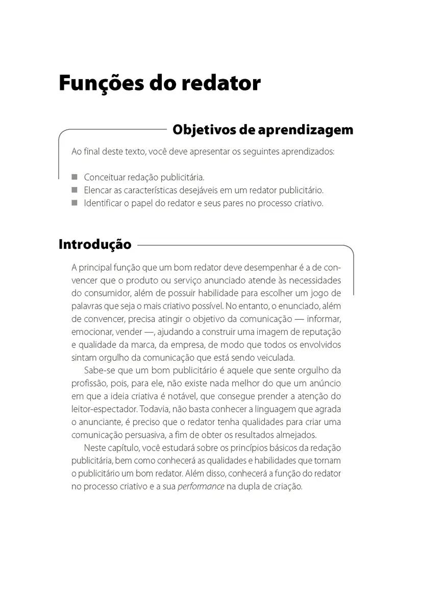 Podcasts, redes sociais, jornais, revistas, panfletos, televisão são alguns exemplos de comunicação que passam, necessariamente, pela redação publicitária. O redator trabalha de modo a aplicar as características da linguagem, suas associações entre ideias e palavras, seus argumentos literais e emocionais e suas técnicas de retórica e persuasão, aos diferentes meios, seja mídia eletrônica, impressa ou multimídia. Neste livro, portanto, você vai estudar a estrutura do texto publicitário técnicas retóricas e persuasivas, argumentação e criatividade, e tudo o que você precisa saber para construir uma boa redação publicitária.
