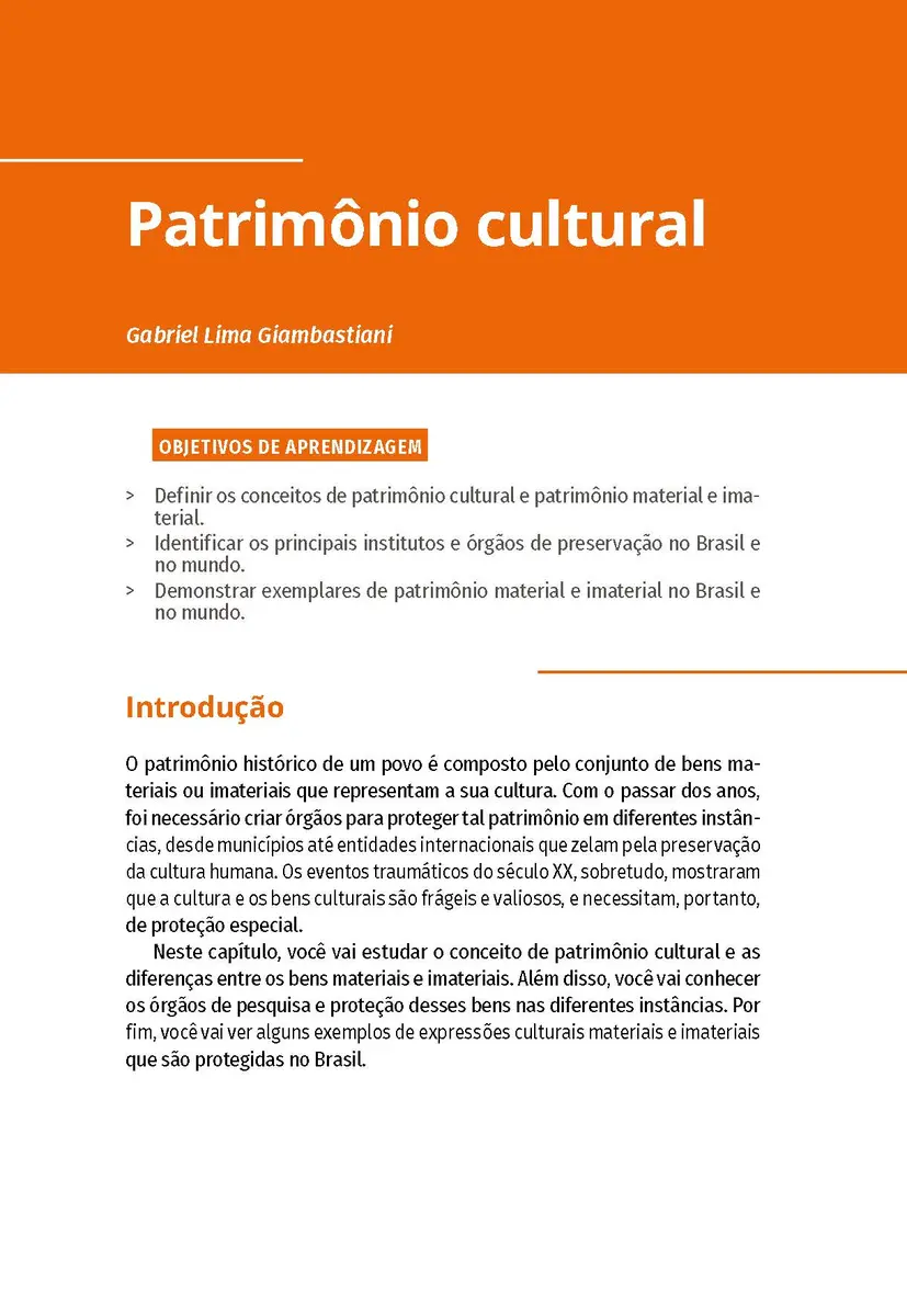 Reconhecer a importância da preservação do patrimônio cultural é fundamental para dar continuidade a um fluxo de conhecimentos, fazeres e exemplares importantes para o imaginário coletivo e a memória afetiva de uma população. Neste livro, você vai conhecer as teorias e os métodos de preservação do patrimônio cultural, compreendendo os princípios gerais de restauração desses bens.