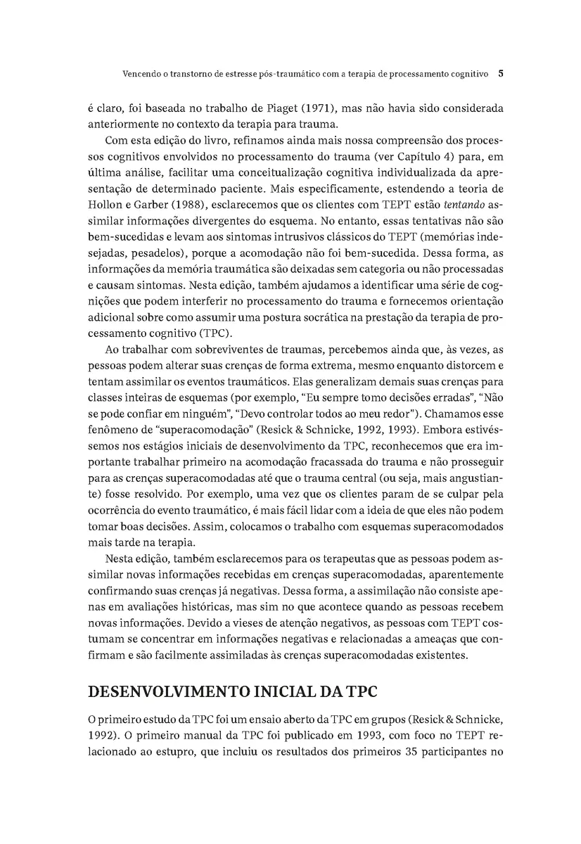 Neste livro voltado a terapeutas que trabalham com pacientes com transtorno de estresse pós-traumático (TEPT), as autoras, desenvolvedoras da terapia de processamento cognitivo (TPC), explicam os fundamentos teóricos e empíricos da técnica. Os capítulos apresentam maneiras de trabalhar efetivamente com populações específicas, como sobreviventes de agressão sexual e outros tipos de violência, clientes culturalmente diversos e LGBTQIA+. Destaques da edição:Apresenta cada sessão em um capítulo específico.Reflete novas pesquisas sobre tratamentos, refinamentos conceituais e feedbacks recebidos no treinamento de milhares de terapeutas.Inclui capítulo sobre conceitualização de caso.Discute variações adicionais de tratamento (telessaúde, TPC intensiva).