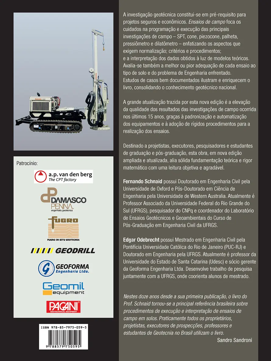 A investigação geotécnica constitui-se em pré-requisito para projetos seguros e econômicos. 'Ensaios de campo' foca os cuidados na programação e execução das principais investigações de campo – SPT, cone, piezocone, palheta, pressiômetro e dilatômetro – enfatizando os aspectos que exigem normalização; critérios e procedimentos; e a interpretação dos dados obtidos à luz de modelos teóricos. Avalia-se também a melhor ou pior adequação de cada ensaio ao tipo de solo e do problema de Engenharia enfrentado. Estudos de casos bem documentados ilustram e enriquecem o livro, consolidando o conhecimento geotécnico nacional.