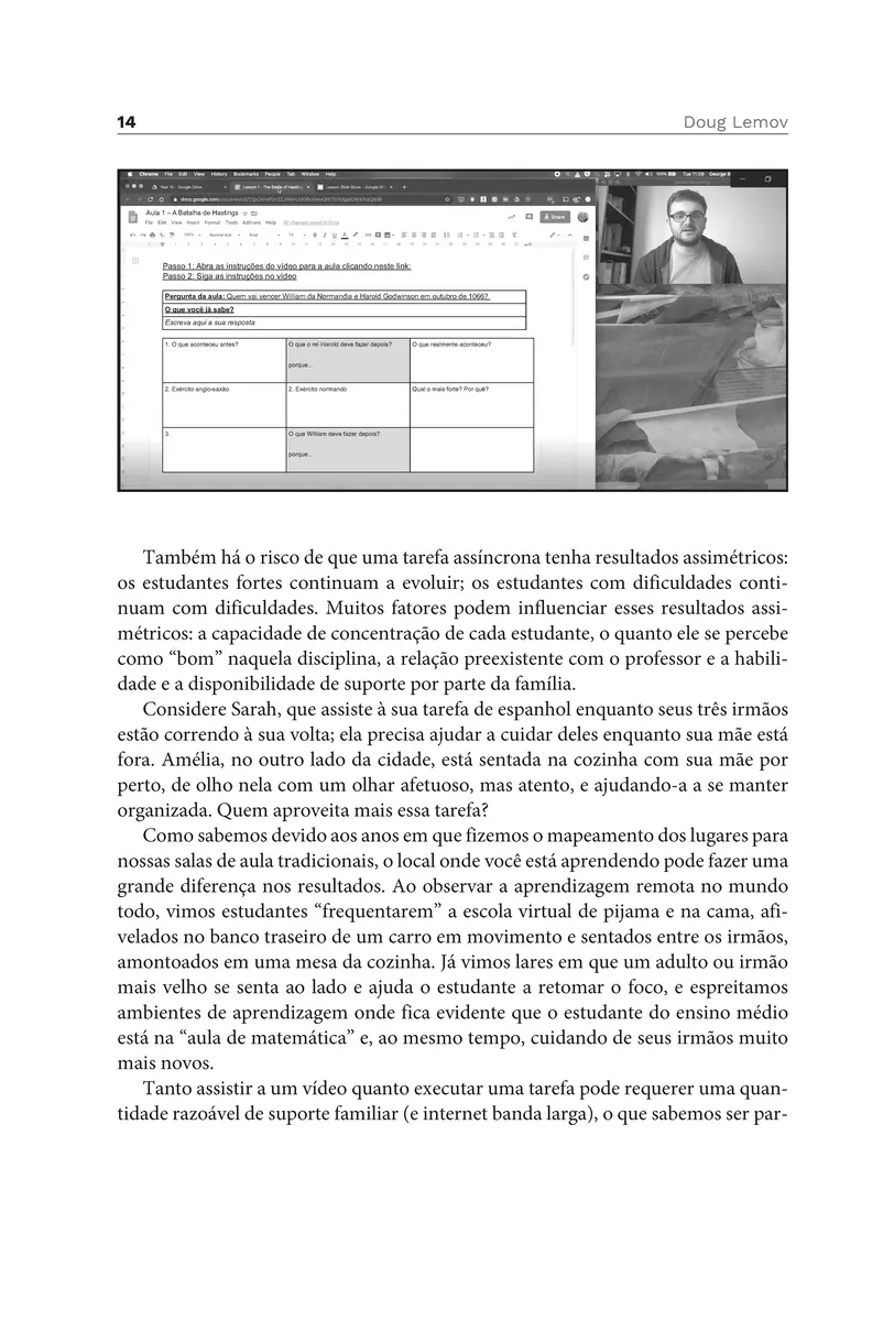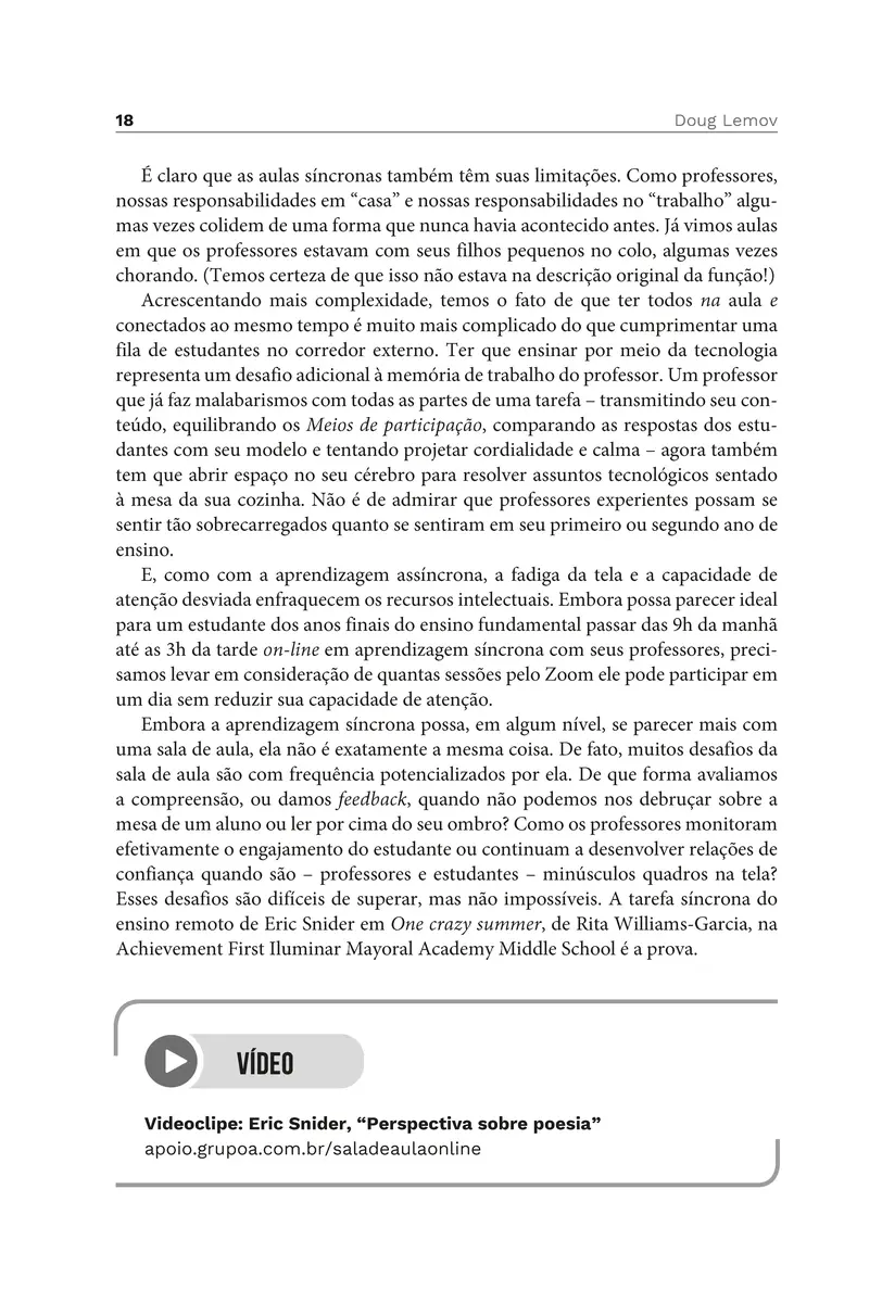 Como ajudar os estudantes a serem bem-sucedidos em ambientes de sala de aula on-line, especialmente quando nós mesmos estamos sob pressão para nos adaptarmos a este novo cenário? Em Ensinando na sala de aula on-line, livro escrito não para especialistas no uso da tecnologia, mas para professores comuns, que estão buscando adaptar suas habilidades de sala de aula para o ensino remoto, Doug Lemov reúne exemplos reais, que mostram como você pode aplicar as técnicas e as dicas reunidas em seus próprios ambientes digitais.