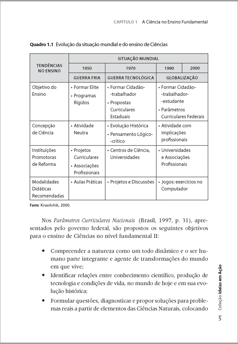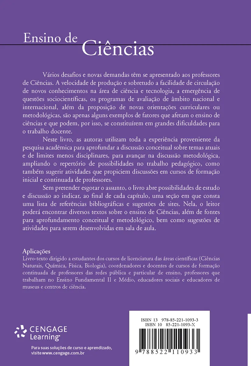 Vários desafios e novas demandas têm se apresentado aos professores de Ciências. A velocidade de produção e sobretudo a facilidade de circulação de novos conhecimentos na área de ciência e tecnologia, a emergência de questões sociocientíficas, os programas de avaliação de âmbito nacional e internacional, além da proposição de novas orientações curriculares ou metodológicas, são apenas alguns exemplos de fatores que afetam o ensino de ciências e que podem, por isso, se constituírem em grandes dificuldades para o trabalho docente. Neste livro, as autoras utilizam toda a experiência proveniente da pesquisa acadêmica para aprofundar a discussão conceitual sobre temas atuais e de limites menos disciplinares, para avançar na discussão metodológica, ampliando o repertório de possibilidades no trabalho pedagógico, como também sugerir atividades que propiciem discussões em cursos de formação inicial e continuada de professores. Sem pretender esgotar o assunto, o livro abre possibilidades de estudo e discussão ao indicar, ao final de cada capítulo, uma seção em que consta uma lista de referências bibliográficas e sugestões de sites. Nela, o leitor poderá encontrar diversos textos sobre o ensino de Ciências, além de fontes para aprofundamento conceitual e metodológico, bem como sugestões de atividades para serem desenvolvidas em sala de aula.