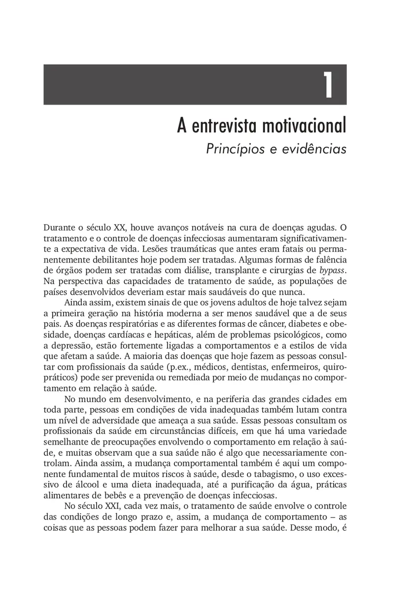 Escrito especificamente para profissionais da saúde, este livro conciso apresenta instrumentos poderosos para promover a comunicação com os pacientes e orientá-los a fazer escolhas para melhorar a sua saúde, desde perder peso, fazer exercícios e parar de fumar, até a adesão à medicação e sexo seguro. “Se você é um profissional da saúde ou da saúde mental que atua em um ambiente médico, e já questionou o que pode fazer com um paciente aparentemente ‘desmotivado’, este livro é para você.” Barent Walsh, PhD, direto-executivo, The Bridge of Central Massachusetts.