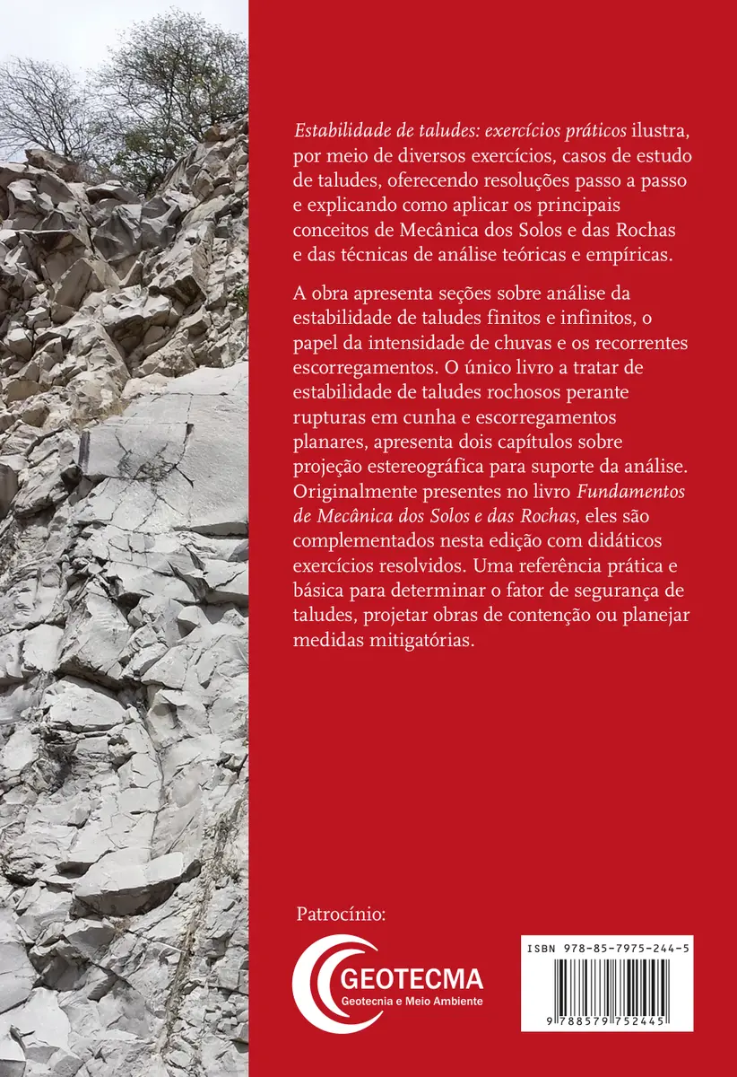 Estabilidade de taludes: exercícios práticos ilustra, por meio de diversos exercícios, casos de estudo de taludes, oferecendo resoluções passo a passo e explicando como aplicar os principais conceitos de Mecânica dos Solos e das Rochas e das técnicas de análise teóricas e empíricas. A obra apresenta seções sobre análise da estabilidade de taludes finitos e infinitos, o papel da intensidade de chuvas e os recorrentes escorregamentos. O único livro a tratar de estabilidade de taludes rochosos perante rupturas em cunha e escorregamentos planares, apresenta dois capítulos sobre projeção estereográfica para suporte da análise. Originalmente presentes no livro Fundamentos de Mecânica dos Solos e das Rochas, eles são complementados nesta edição com didáticos exercícios resolvidos. Uma referência prática e básica para determinar o fator de segurança de taludes, projetar obras de contenção ou planejar medidas mitigatórias.