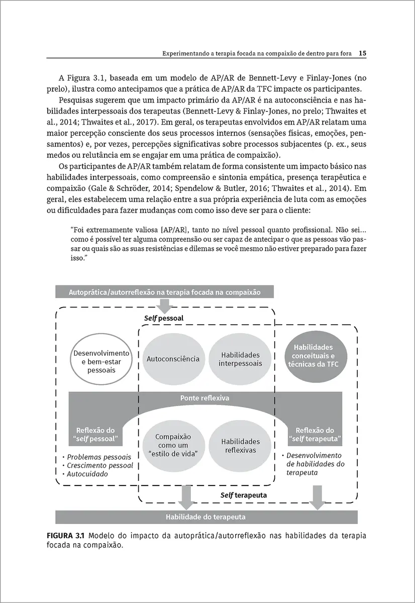 Para os terapeutas que desejam desenvolver suas habilidades em terapia focada na compaixão (TFC), este livro apresenta uma abordagem de treinamento exclusiva baseada em evidências. A autoprática/autorreflexão (AP/AR) permite que os clínicos apliquem as técnicas da TFC a si mesmos e reflitam sobre a experiência à medida que trabalham em 34 módulos breves e cuidadosamente elaborados. Escrita por instrutores experientes que elucidam as múltiplas camadas da TFC, a obra integra terapia cognitivo-comportamental (TCC), ciência evolutiva, mindfulness e outras abordagens com a apresentação de exemplos clínicos e materiais para apoiar a prática.