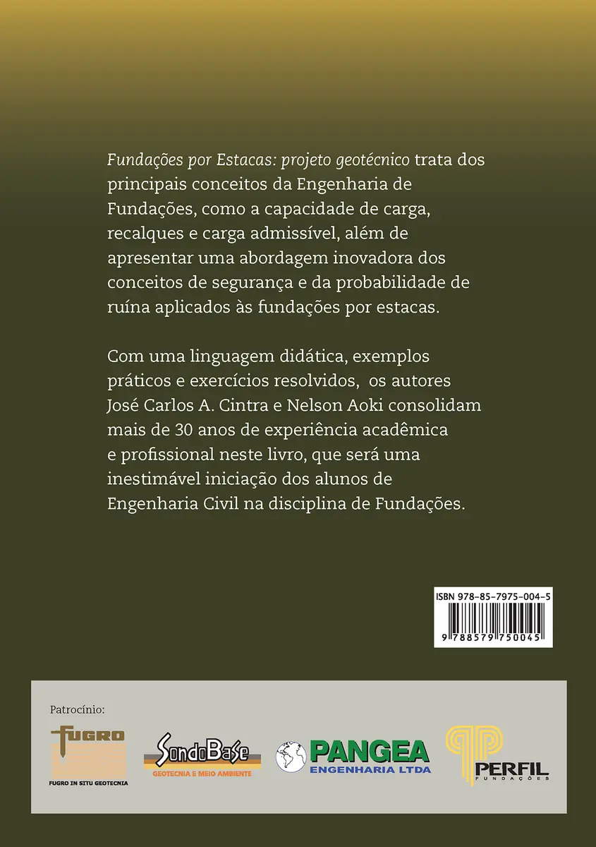 Fundações por Estacas: projeto geotécnico trata dos principais conceitos da Engenharia de Fundações, como a capacidade de carga, recalques e carga admissível, além de apresentar uma abordagem inovadora dos conceitos de segurança e da probabilidade de ruína aplicados às fundações por estacas.