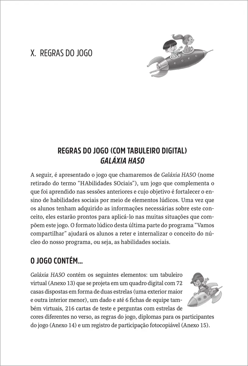 Galáxia HA(bilidades) SO(ciais), além de explicar o que é o bullying, mostrando sua realidade atual, propõe um novo programa de prevenção focado no desenvolvimento de habilidades sociais. O livro também inclui o jogo Galáxia HASO para que os alunos possam, em sala de aula, praticar e fortalecer as habilidades adquiridas.