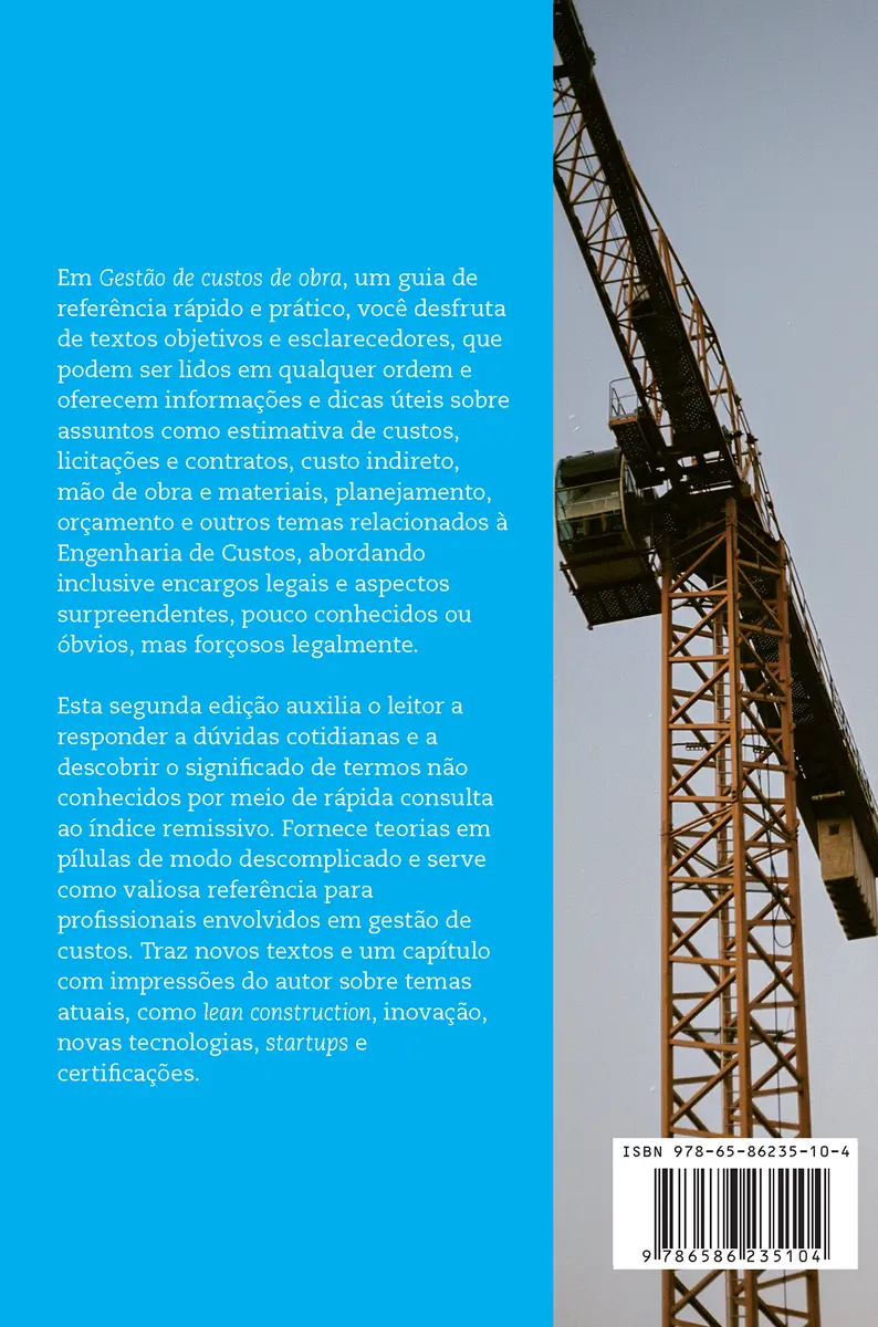 Em Gestão de custos de obra, um guia de referência rápido e prático, você desfruta de textos objetivos e esclarecedores, que podem ser lidos em qualquer ordem e oferecem informações e dicas úteis sobre assuntos como estimativa de custos, licitações e contratos, custo indireto, mão de obra e materiais, planejamento, orçamento e outros temas relacionados à Engenharia de Custos, abordando inclusive encargos legais e aspectos surpreendentes, pouco conhecidos ou óbvios, mas forçosos legalmente. Esta segunda edição auxilia o leitor a responder a dúvidas cotidianas e a descobrir o significado de termos não conhecidos por meio de rápida consulta ao índice remissivo. Fornece teorias em pílulas de modo descomplicado e serve como valiosa referência para profissionais envolvidos em gestão de custos. Traz novos textos e um capítulo com impressões do autor sobre temas atuais, como lean construction, inovação, novas tecnologias, startups e certificações.