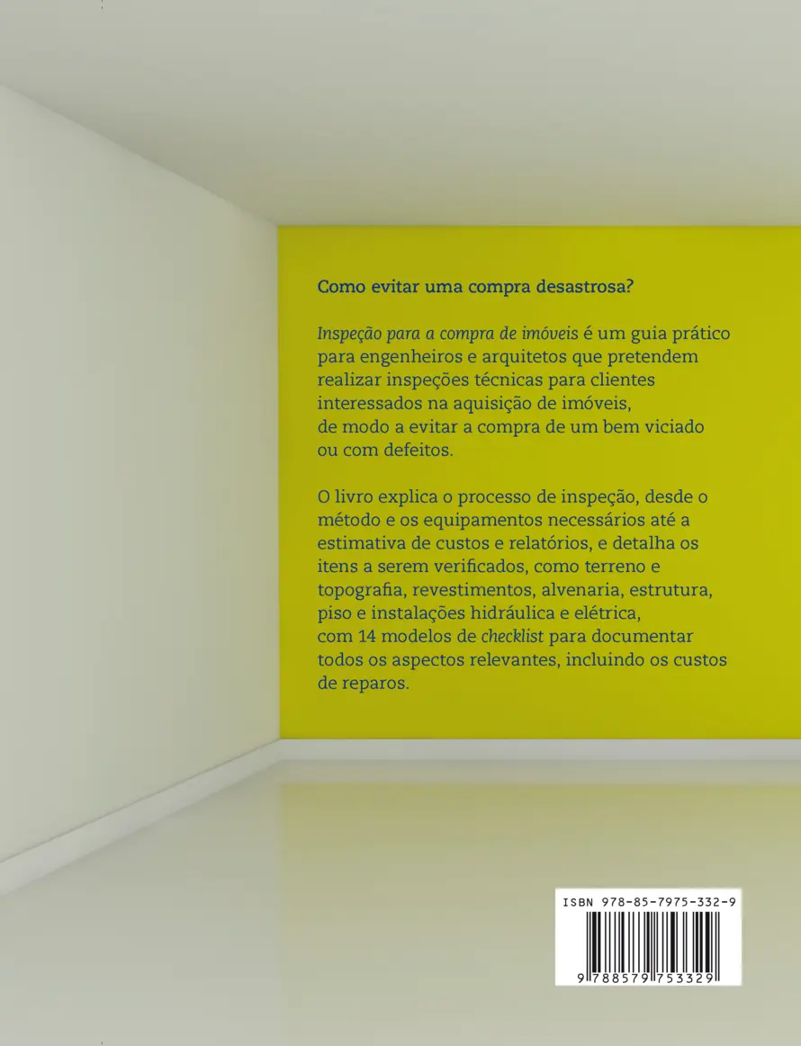 Inspeção para compra de imóveis é um guia prático para engenheiros e arquitetos que pretendem realizar inspeções técnicas para clientes interessados na aquisição de imóveis, de modo a evitar a compra de um bem viciado ou com defeitos.O livro explica o processo de inspeção, desde o método e os equipamentos necessários até a estimativa de custos e relatórios, e detalha os itens a serem verificados, como terreno e topografia, revestimentos, alvenaria, estrutura, piso e instalações hidráulica e elétrica, com 14 modelos de checklist para documentar todos os aspectos relevantes, incluindo os custos de reparos.