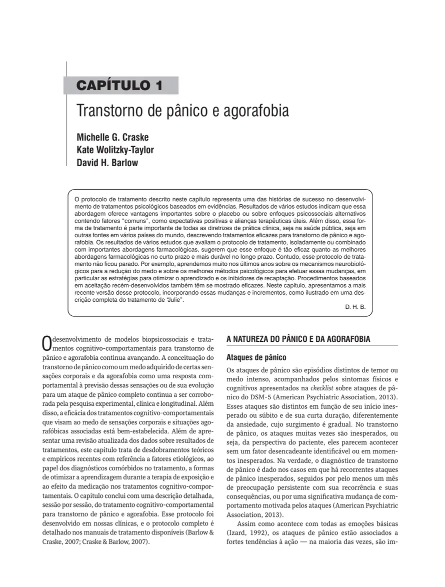 David H. Barlow, Professor emérito de psicologia e psiquiatria, fundador e diretor emérito do Center for Anxiety and Related Disorders, da Boston University. Publicou mais de 650 artigos e capítulos e mais de 90 livros e manuais clínicos, sendo a maioria na área de transtornos emocionais e metodologia de pesquisa clínica. Seus livros e manuais já foram traduzidos para mais de 20 idiomas. Os inúmeros prêmios e citações do Dr. Barlow incluem três dos mais altos reconhecimentos da área da psicologia: o Distinguished Scientific Award for the Applications of Psychology, da American Psychological Association; o James McKeen Cattell Fellow Award, da Association for Psychological Science; e a Gold Medal Award for Life Achievement in the Practice of Psychology, da American Psychological Foundation.