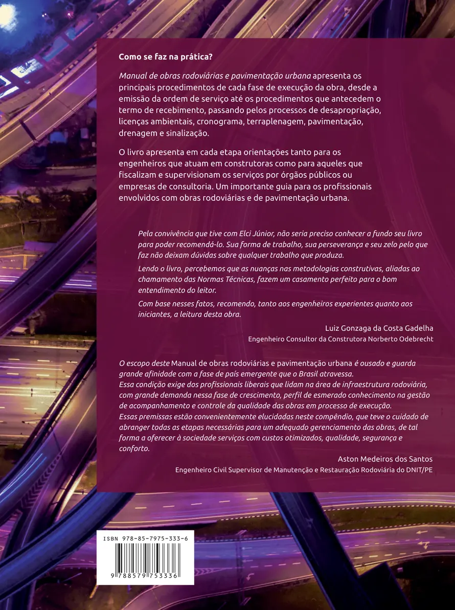Como se faz na prática? Manual de obras rodoviárias e pavimentação urbana apresenta os principais procedimentos de cada fase de execução da obra, desde a emissão da ordem de serviço até os procedimentos que antecedem o termo de recebimento, passando pelos processos de desapropriação, licenças ambientais, cronograma, terraplenagem, pavimentação, drenagem e sinalização. O livro apresenta em cada etapa orientações tanto para os engenheiros que atuam em construtoras como para aqueles que fiscalizam e supervisionam os serviços por órgãos públicos ou empresas de consultoria. Um importante guia para os profissionais envolvidos com obras rodoviárias e de pavimentação urbana.