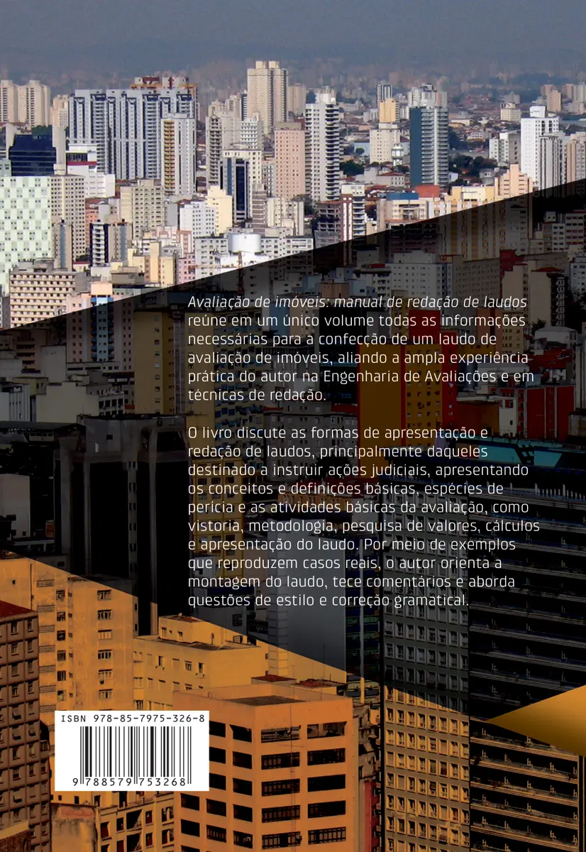 Avaliação de imóveis: manual de redação de laudos reúne em um único volume todas as informações necessárias para a confecção de um lado de avaliação de imóveis, aliando a ampla experiência prática do autor na Engenharia de Avaliações e em técnicas de redação. O livro discute as formas de apresentação e redação de laudos, principalmente daqueles destinados a instruir ações judiciais, apresentando os conceitos e definições básicas, espécies de perícia e as atividades básicas da avaliação, como vistoria, metodologia, pesquisa de valores, cálculos e apresentação do laudo. Por meio de exemplos que reproduzem casos reais, o autor orienta a montagem do laudo, tece comentários e aborda questões de estilo e correção gramatical.