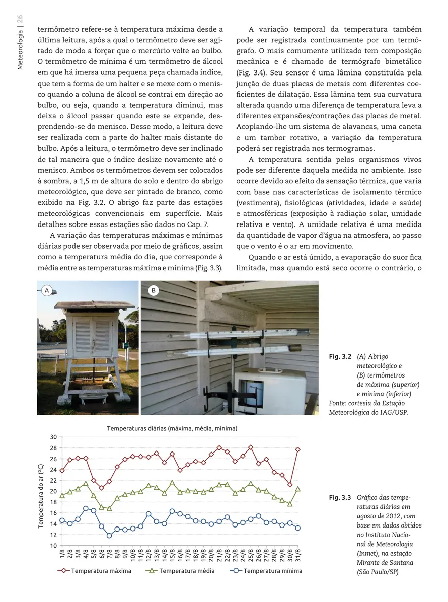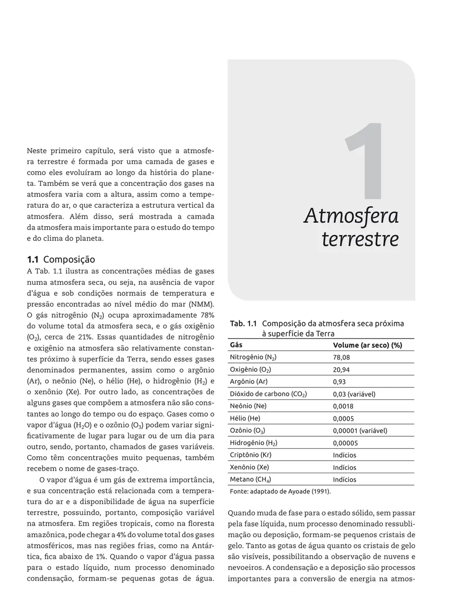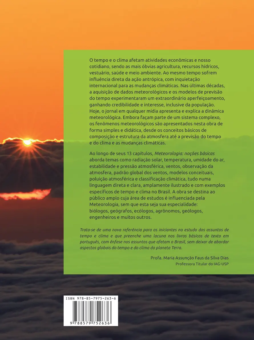Ao longo de seus 13 capítulos, Meteorologia aborda temas como radiação solar, temperatura, umidade do ar, estabilidade e pressão atmosférica, ventos, observação da atmosfera, padrão global dos ventos, modelos conceituais, poluição atmosférica e classificação climática, tudo numa linguagem direta e clara, amplamente ilustrado e com exemplos específicos de tempo e clima no Brasil. A Obra se destina ao público amplo cuja área de estudos é influenciada pela Meteorologia, sem que esta seja sua especialidade: biólogos, geógrafos, ecólogos, agrônomos, geólogos, engenheiros e muitos outros.